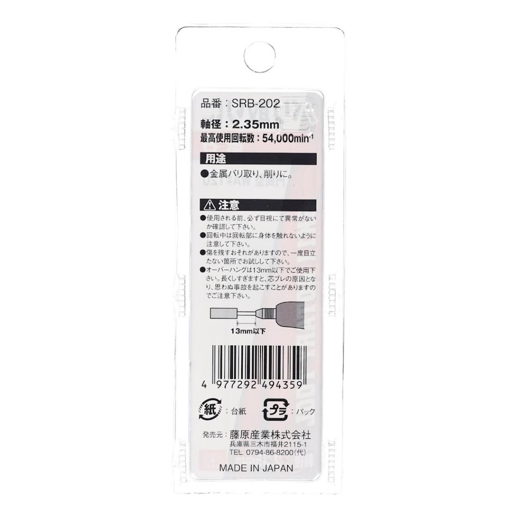 The SK11 Japanese Abrasive Stone Point, model SRB-202, is ideal for deburring and grinding metal. With dimensions of 7 mm width, 50 mm height, and 7 mm depth, and a weight of just 3 g, this tool is perfect for precise work. It features a cylindrical shape and WA#120 grit, with a 2.35 mm shank and a maximum allowable rotation speed of 20000 RPM.