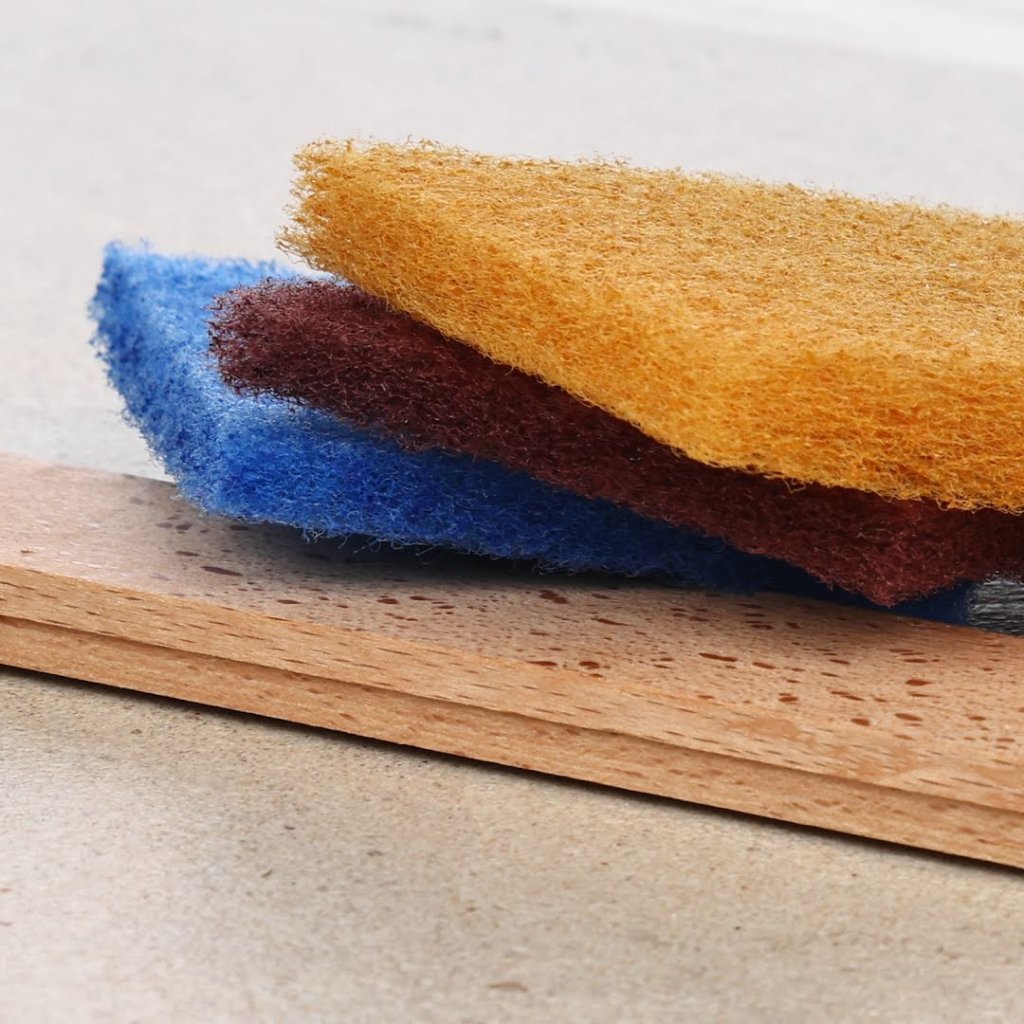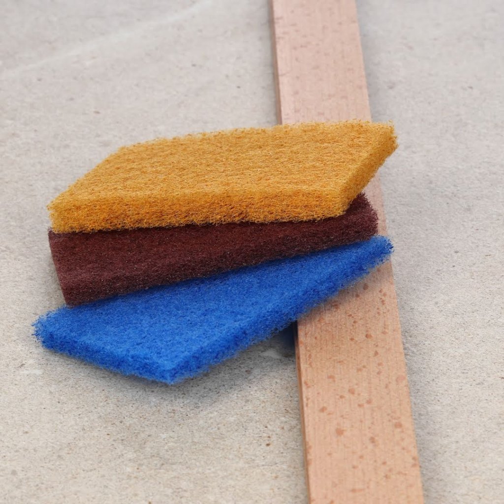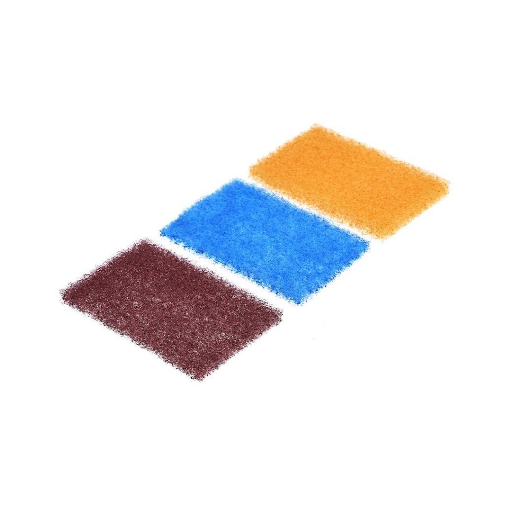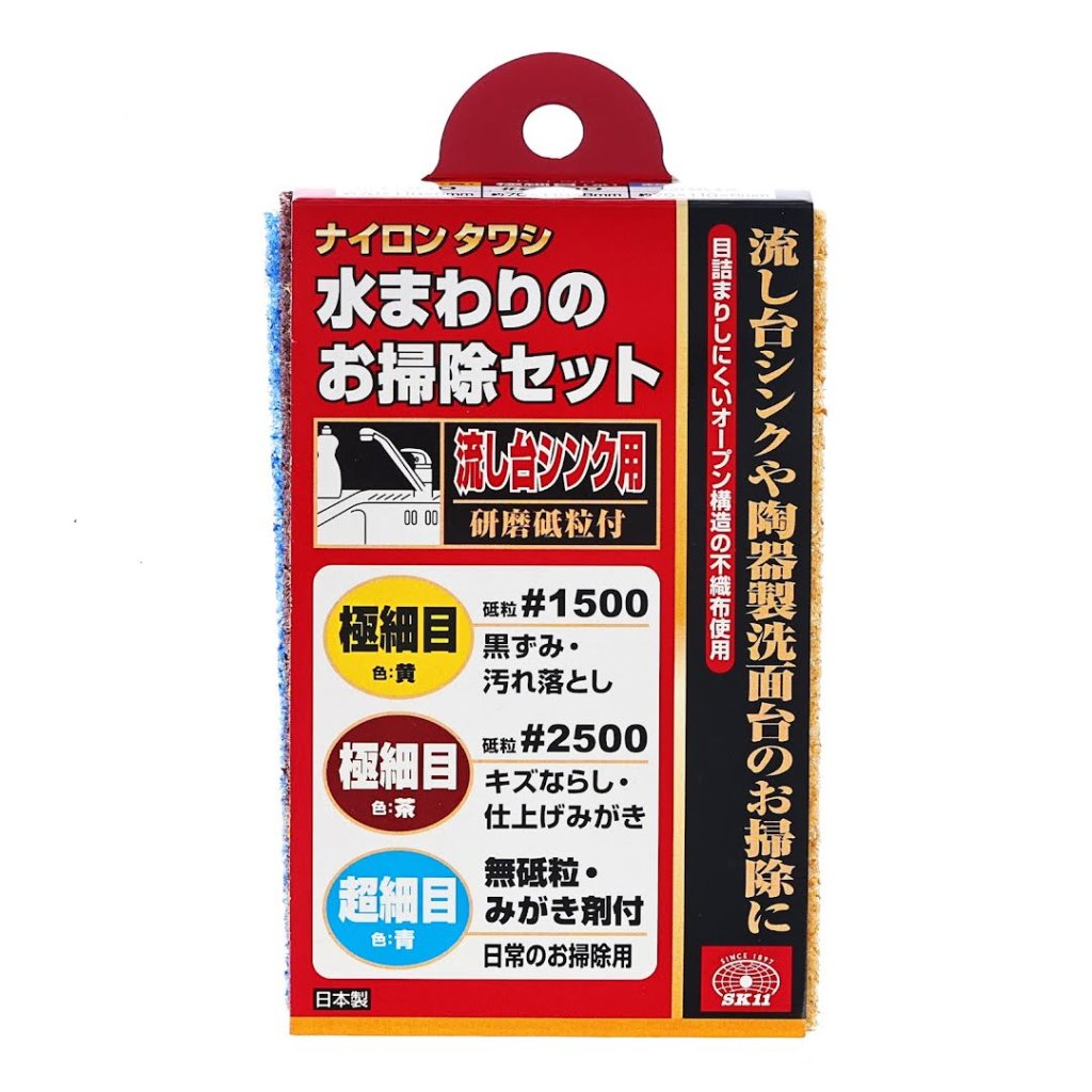 The SK11 Japanese Non-Woven Abrasive Hand Pad Set is an ideal solution for cleaning around the sink and washbasin. This set includes three pads for cleaning, finishing polish, and daily maintenance. Each pad is made from a non-clogging, open-structured, non-woven fabric, offering flexibility and elasticity to adapt to curved surfaces. The pads can be used with water or detergent and contain eco-friendly, non-toxic ingredients for safe use. Each pad measures 70 x 110 x 8 mm and comes in yellow (#1500 grit), brown (#2500 grit), and blue (non-abrasive).