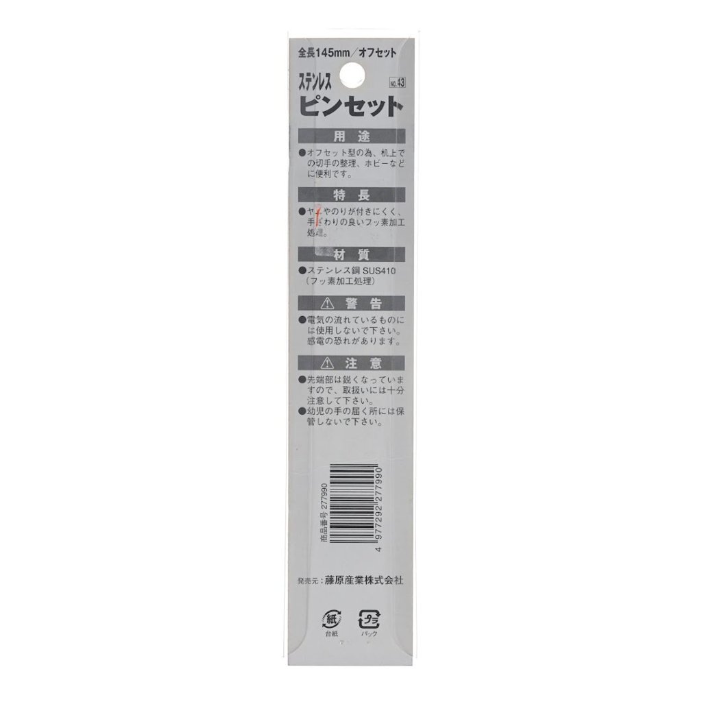 The SK11 Japanese Offset Craft Tweezers, model No.43, are designed for organizing stamps, crafting, and other delicate tasks. These tweezers feature a convenient offset shape, making them ideal for flat surfaces. With a total length of 145 mm, they boast a fluorine coating that ensures a comfortable grip and minimizes the adhesion of resin and glue.