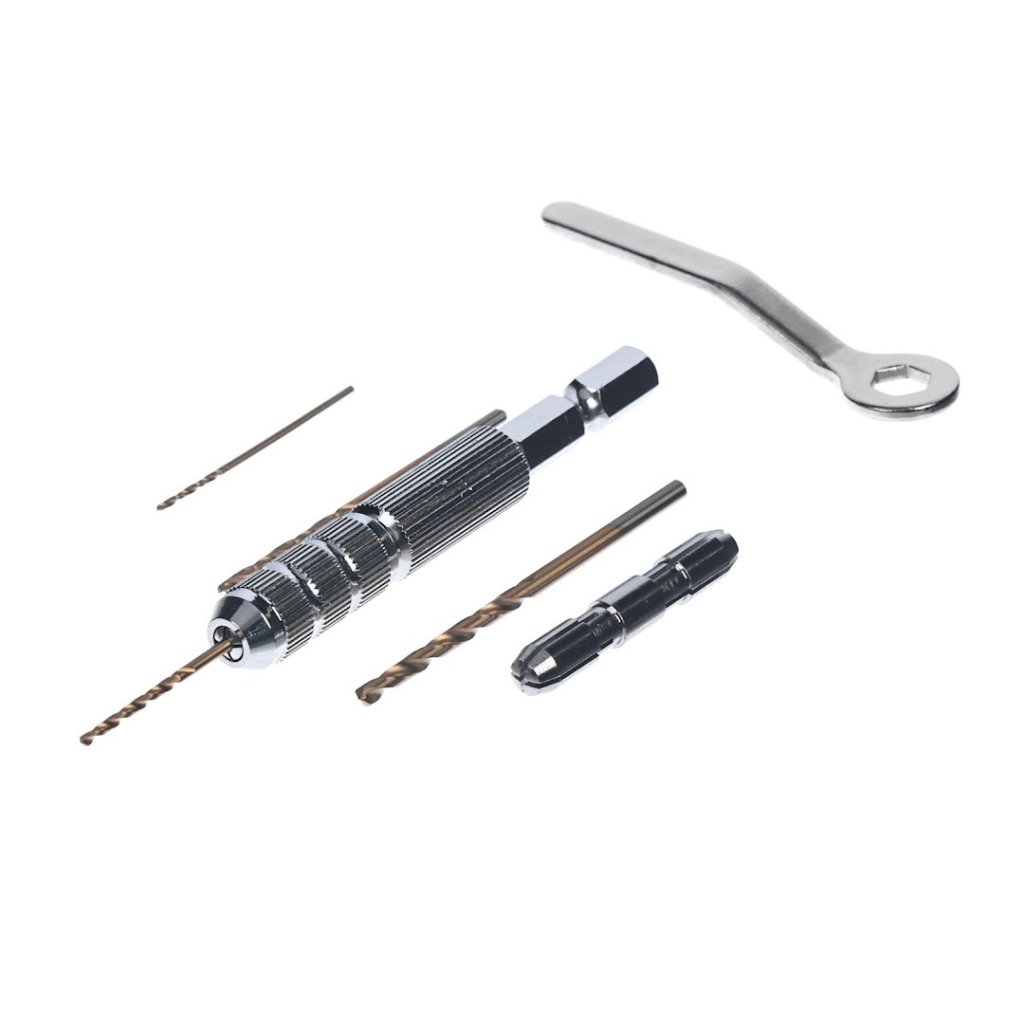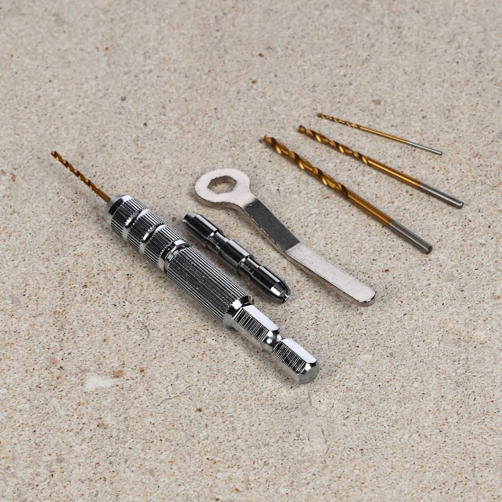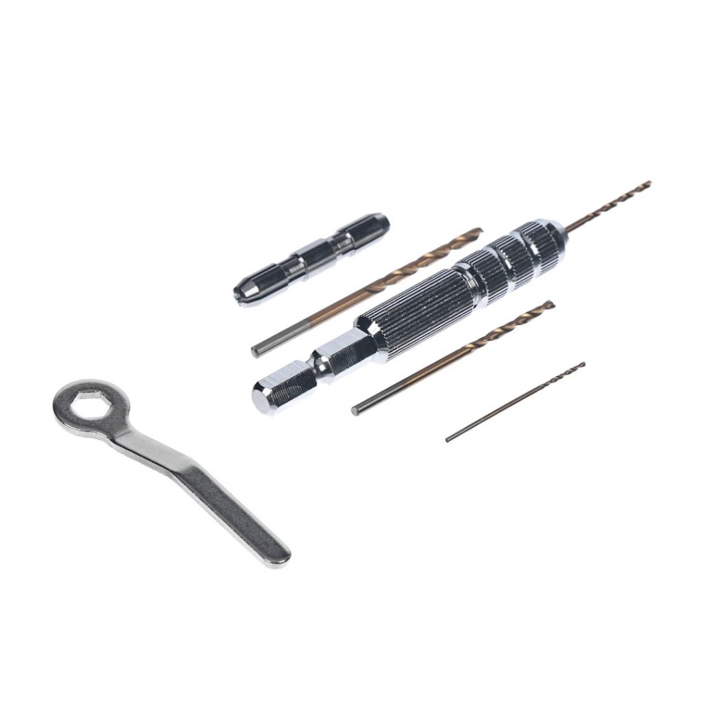 The SK11 Japanese Pin Vise Drill, model No.A, is designed for precise drilling in woodwork, plastic, and aluminum sheets. It has a powerful tightening wrench and is ideal for creating small-diameter holes in projects like models and circuit boards. The drill features a 6.35 mm hexagonal shaft and is compatible with electric drills, drill presses, and cordless drills.