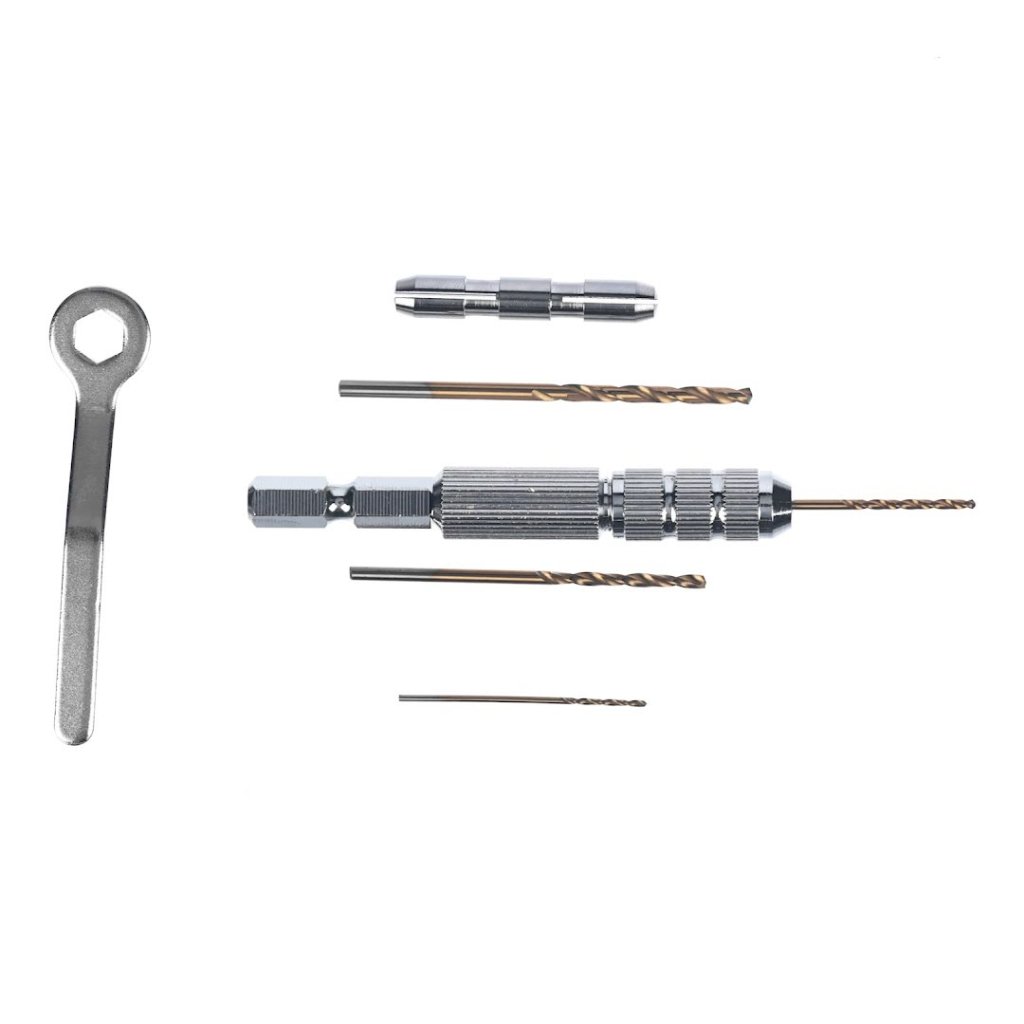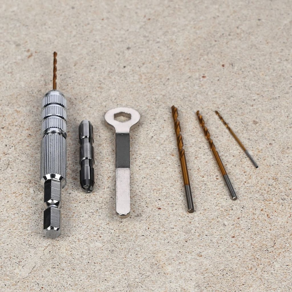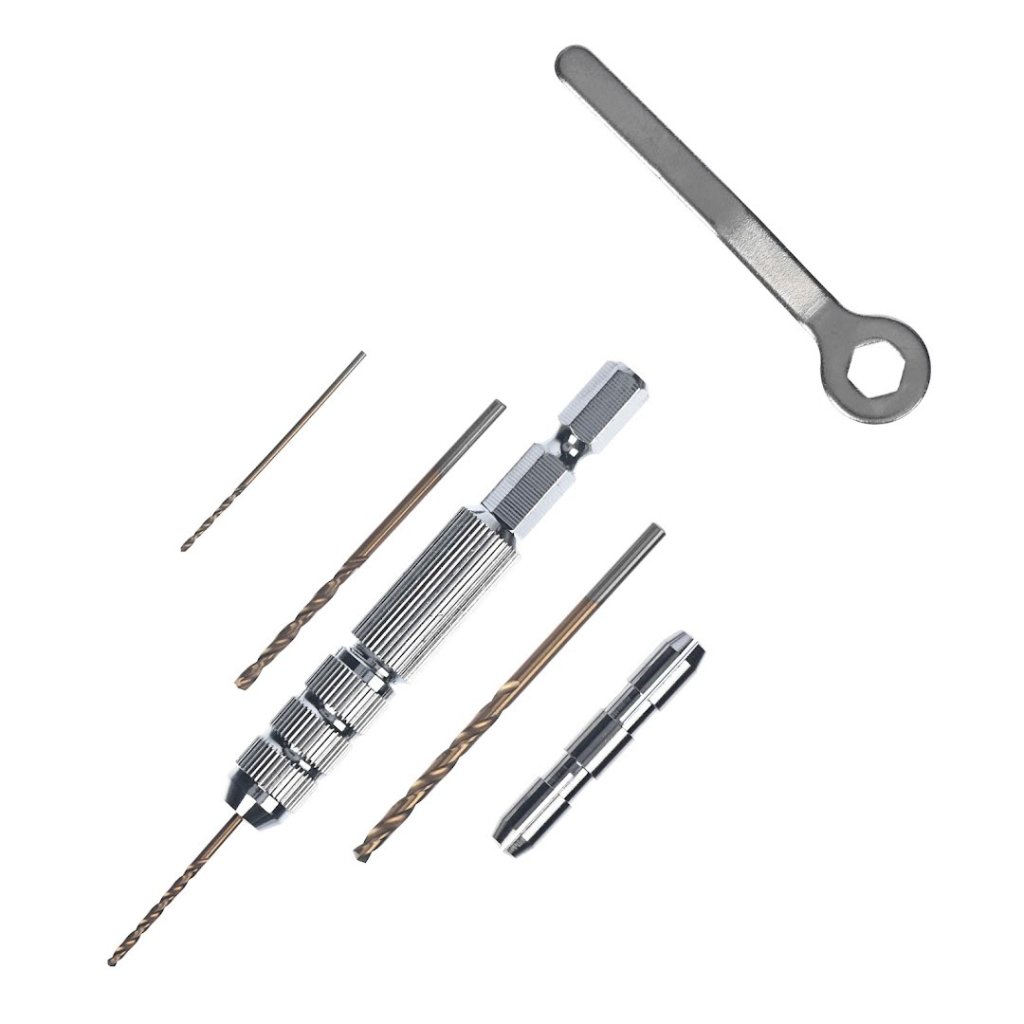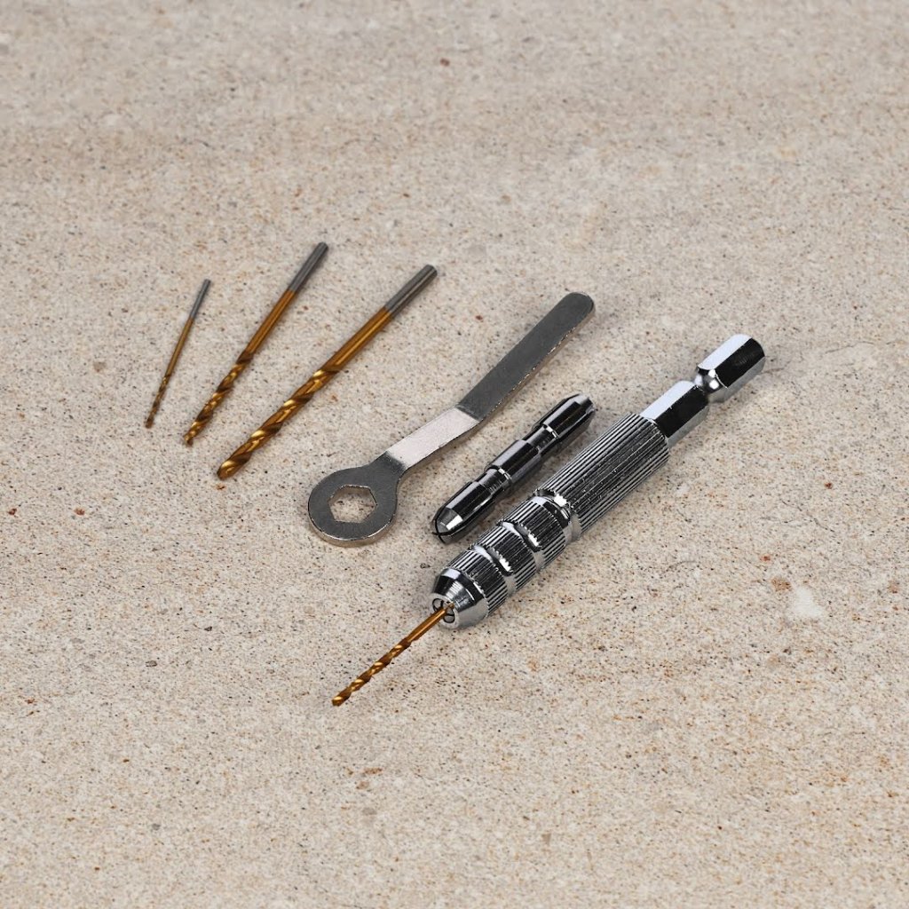 The SK11 Japanese Pin Vise Drill, model No.A, is designed for precise drilling in woodwork, plastic, and aluminum sheets. It has a powerful tightening wrench and is ideal for creating small-diameter holes in projects like models and circuit boards. The drill features a 6.35 mm hexagonal shaft and is compatible with electric drills, drill presses, and cordless drills.