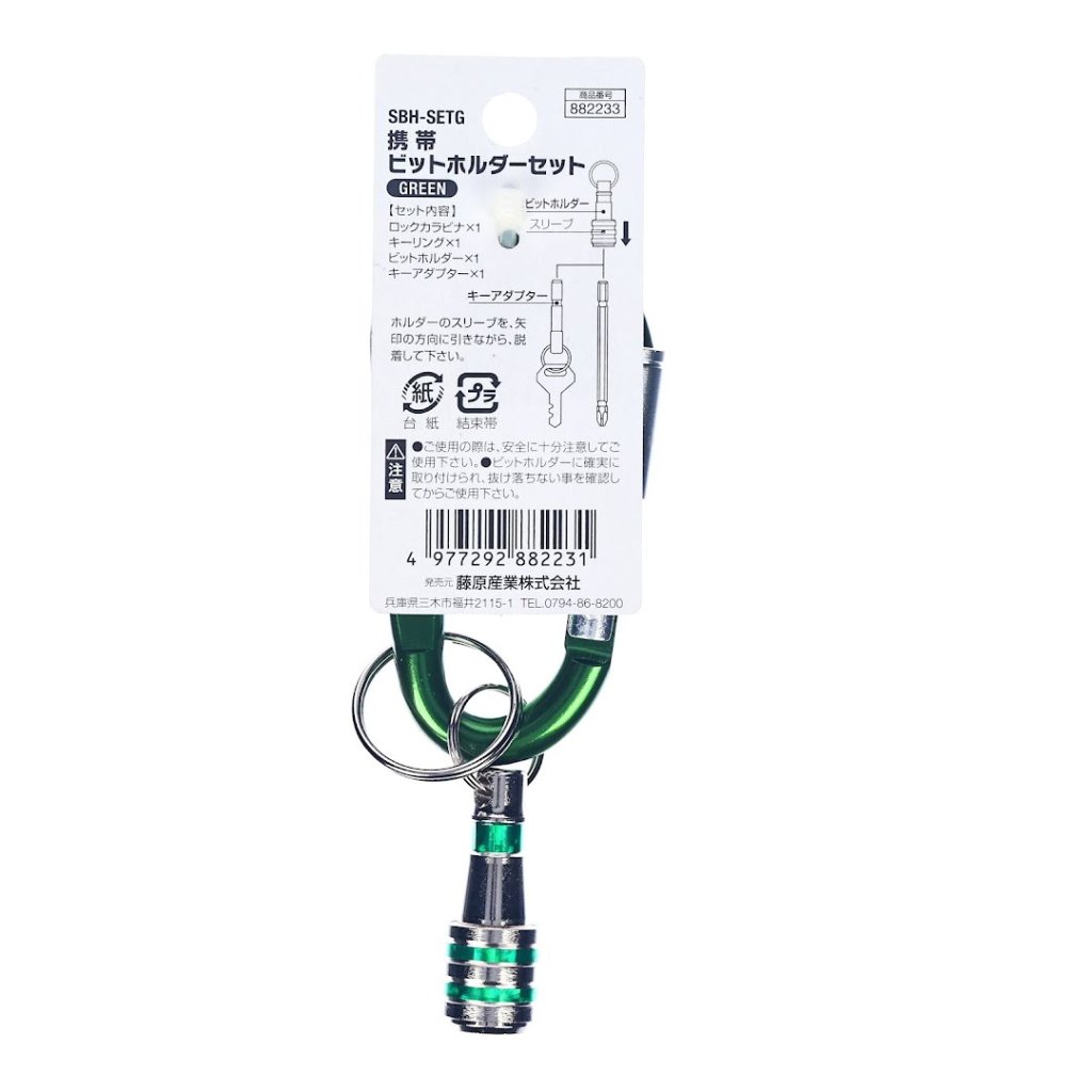 The SK11 Japanese Portable Bit Holder Set, model SBH-SETG, is a versatile solution for securing tools and keys. It features a screw-lock carabiner to prevent accidental drops and allows flexible attachment locations. The slide-on design ensures easy swapping, and its 2-ball lock mechanism provides added safety. This set supports 6.35 mm shafts and includes a key adapter for round shafts.