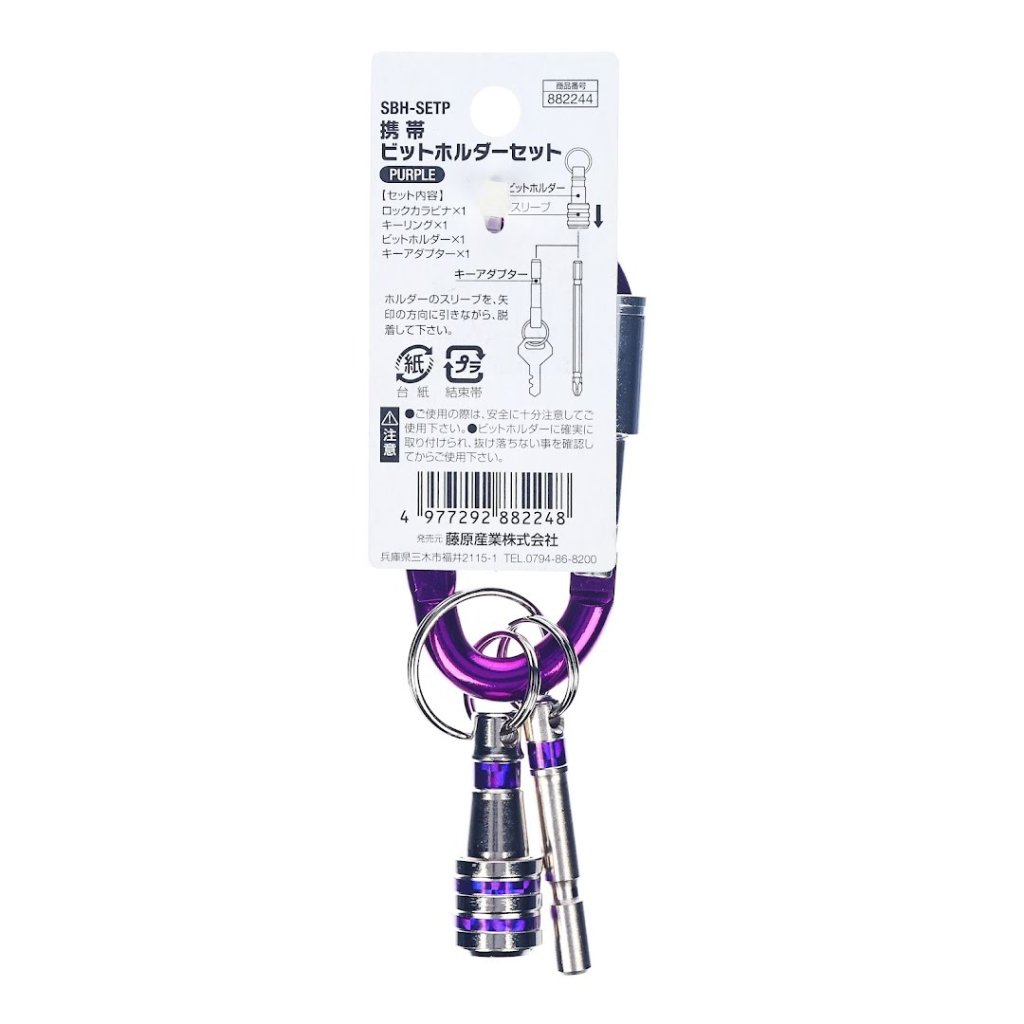 The SK11 Portable Bit Holder Set, model SBH-SETP, is a versatile tool designed to hold bits and keys securely. This set ensures safe and reliable usage by featuring a screw-lock carabiner to prevent accidental drops. The bit holder is compatible with 6.35 mm shafts and includes a 2-ball lock quick holder for easy bit replacement. This set is perfect for on-the-go use with a compact design of 40 mm width, 130 mm height, and 20 mm depth.