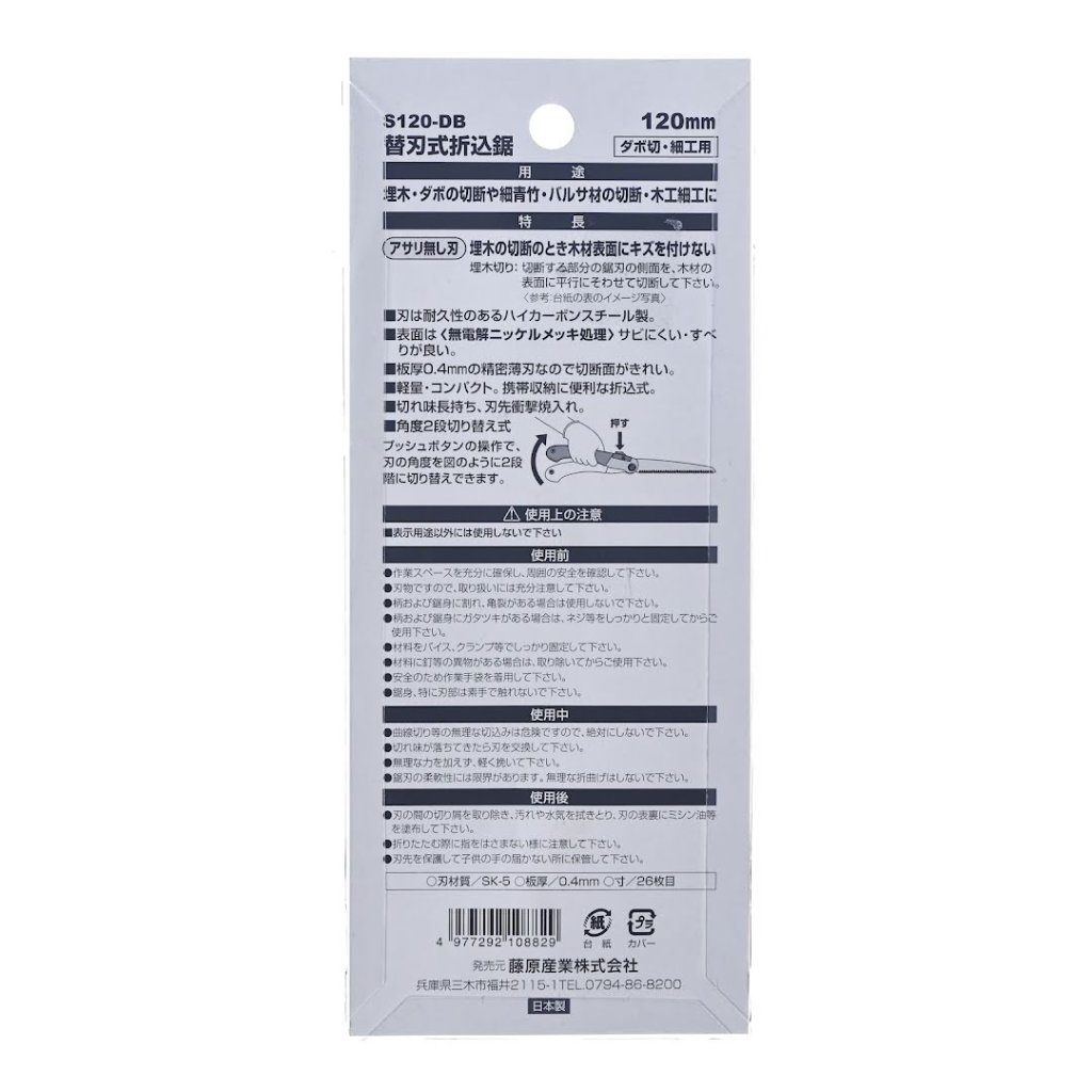 The SK11 Japanese Pull Cut Precision Folding Saw, model S120-DB, is designed for cutting dowels and inlaid wood without damaging the surface. This saw features a durable high-carbon steel blade with an electroless nickel plating for rust resistance and smooth operation. The precise thin blade (0.4 mm) ensures clean cuts, and the ergonomic elastomer resin grip provides a comfortable and secure hold. The blade angle can be adjusted in two stages with a push-button mechanism.