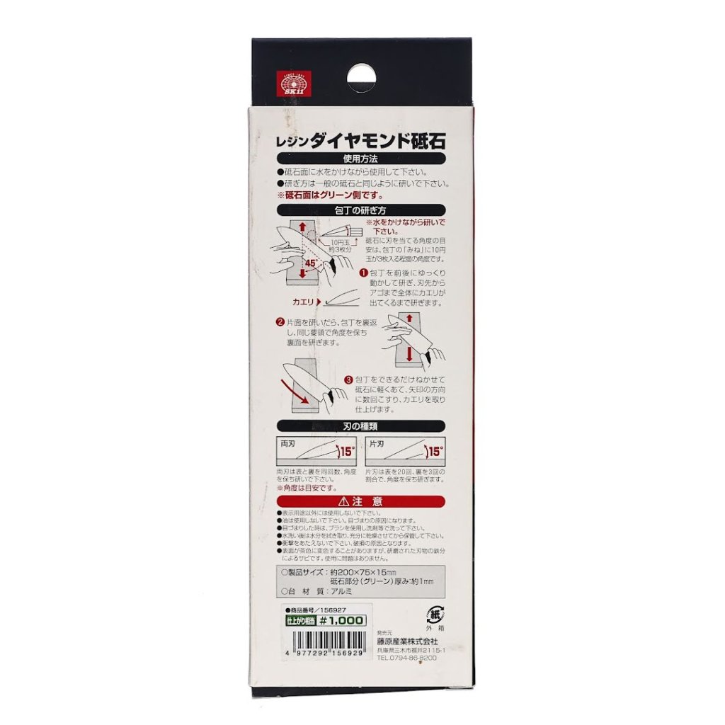 The SK11 Japanese Resinoid Bond Diamond Stone is designed for sharpening a wide range of blades, from household knives to carbide tools. With a #1000 grit equivalent, it provides a fine finish, ensuring precision and sharpness. The stone features a green sharpening surface with a thickness of approximately 1 mm, making it ideal for hard materials like ceramics. It is a robust, durable sharpening tool measuring 75 x 205 x 18 mm and weighing 670 g. Avoid using oil as it may clog the stone; clean it with a brush and detergent instead, and ensure it is dry before storage.