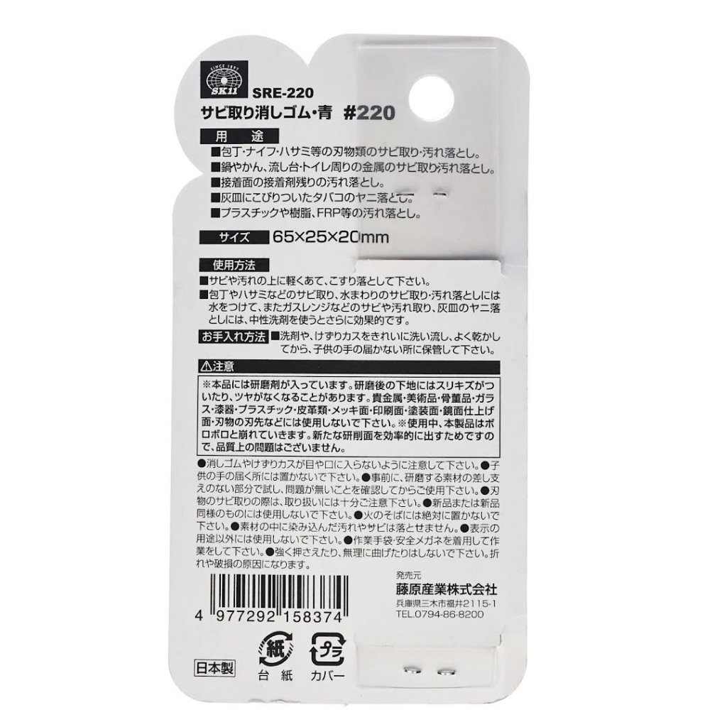 The SK11 Japanese Rust Eraser, model SRE-220, is designed for efficient rust and dirt removal from various metal surfaces. It has a fine #220 grit with WA abrasive particles and excels in cleaning stubborn dirt and rust. This eraser is made from natural rubber, allowing curved surfaces to fit easily. It is ideal for use on knives, scissors, and kitchenware, but can also tackle adhesive residues and plastic and resin stains. Compact and easy to handle, it measures 25 x 65 x 20 mm and weighs 58 g.