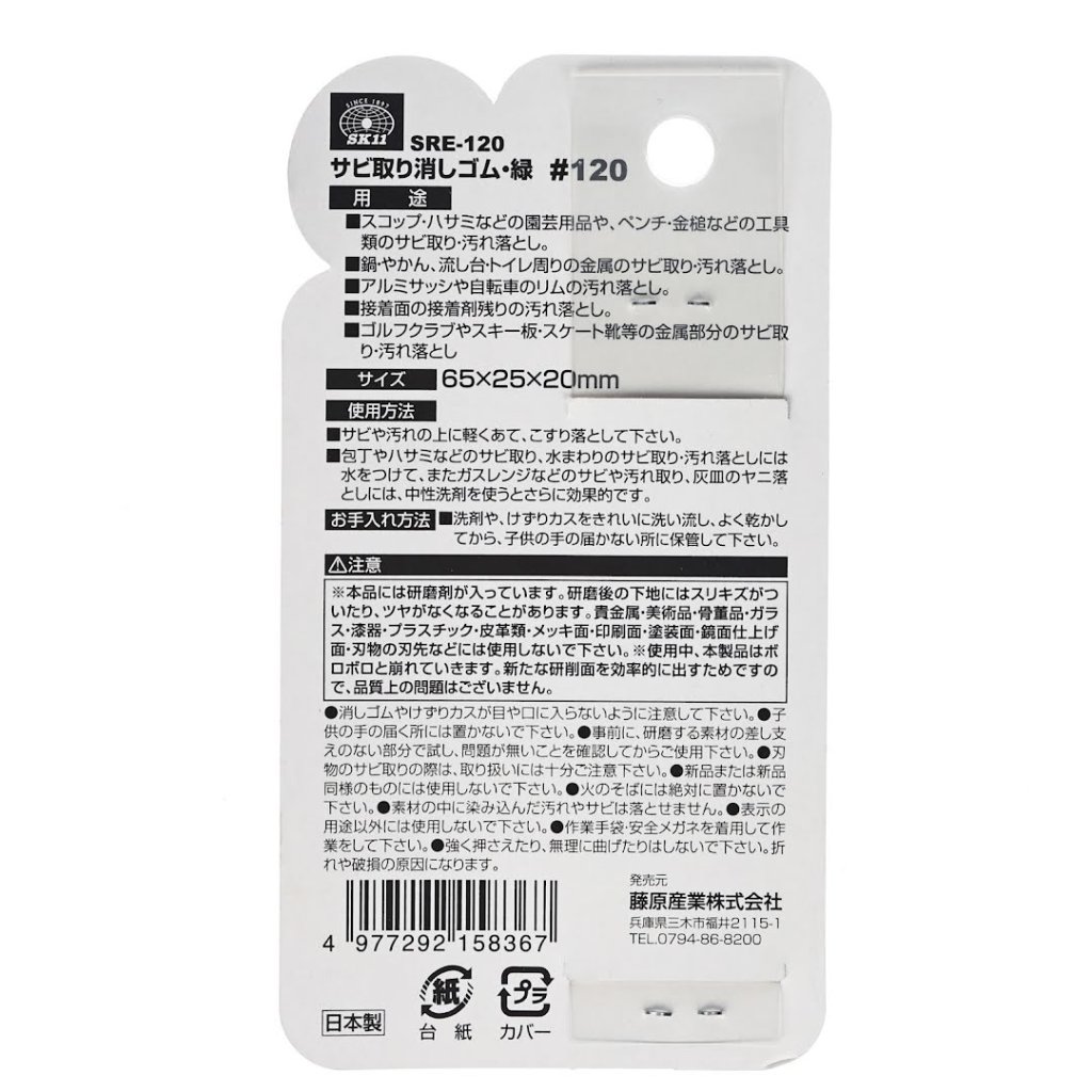 The SK11 Japanese Rust Eraser, model SRE-120, is designed to effectively remove stubborn rust and dirt from various surfaces. Its excellent abrasive power and flexible natural rubber construction make it easy to use on curved surfaces. It's ideal for cleaning gardening tools, kitchen sinks, and bike rims. The easy-to-cut shape allows for versatile use, making it a handy tool for any DIY enthusiast.