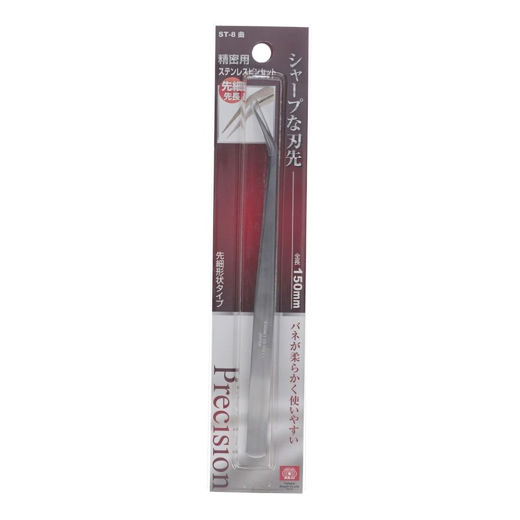 The SK11 Japanese Sharp Curved Tip Precision Tweezers, model ST-8, are perfect for precision work in hobbies, model building, and delicate craftsmanship. Measuring 150 mm long and weighing just 15 g, these tweezers feature a curved, fine-point tip for accurately handling small parts. The soft spring mechanism ensures ease of use, making it ideal for detailed tasks.