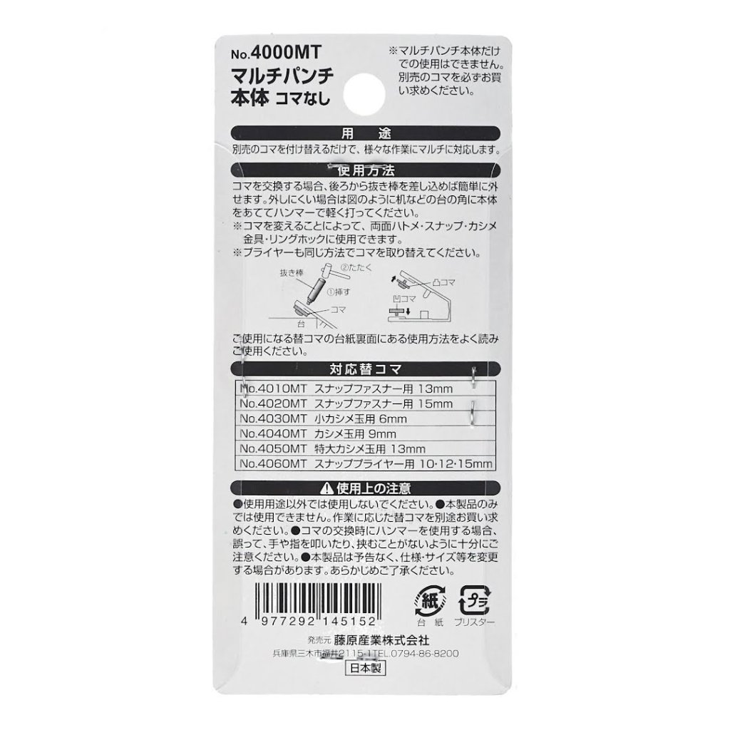 The SK11 Japanese Snap Fastener Plier, model No.4000MT, is a versatile tool designed for repair and reinforcement tasks. By changing the interchangeable heads (sold separately), this multi-punch plier can be adapted for various applications. The product dimensions are 25 x 75 x 22 mm and weigh 10.4 g. Please note that the plier cannot be used without the appropriate multi-punch heads. Be sure to drill a pilot hole before using it and reinforce weak areas with sturdy backing material if necessary.