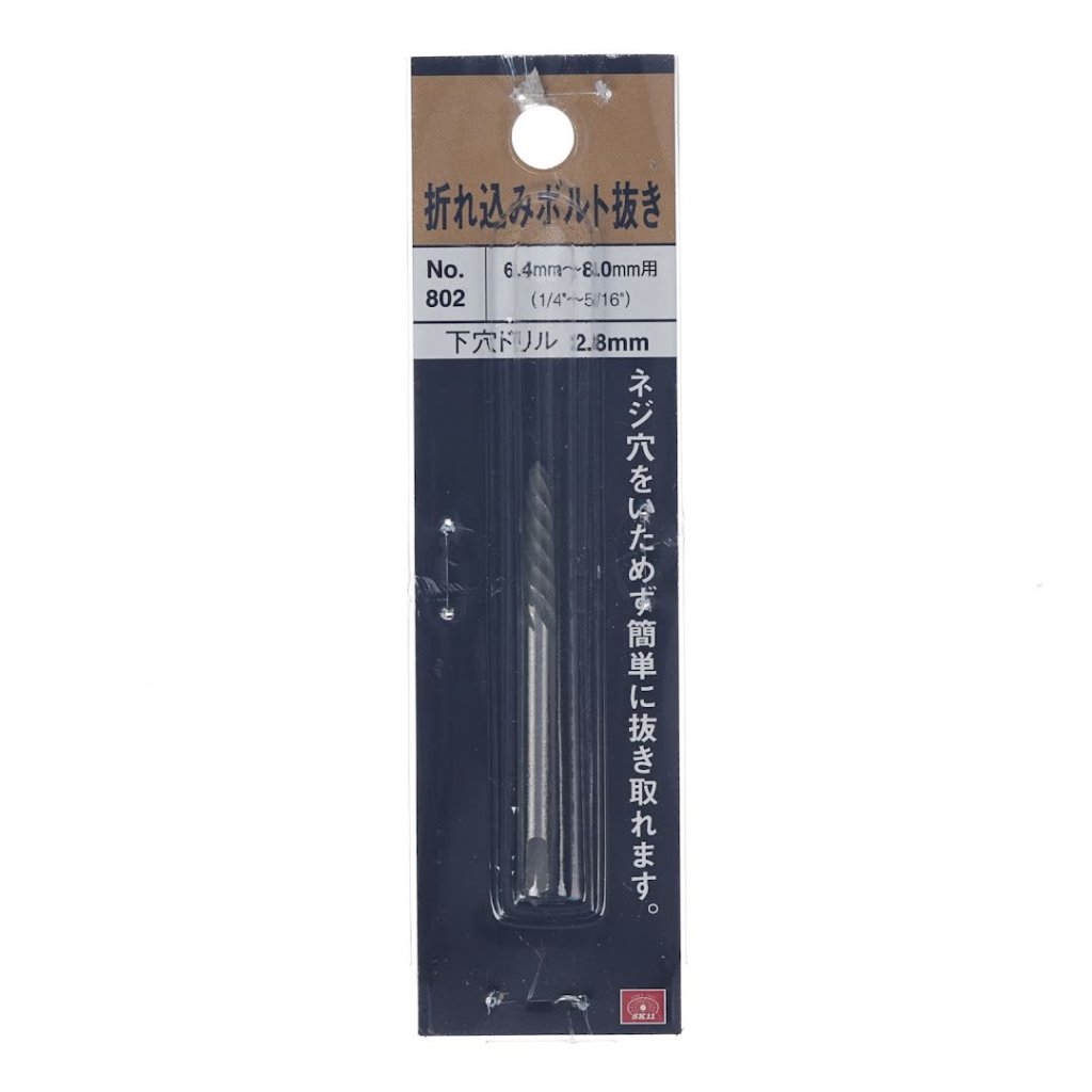 The SK11 Japanese Spiral Screw Extractor, model No.802, is designed for removing broken bolts and pipes without damaging the screw holes. This tool is ideal for manual and electric extraction, measuring 5 mm in width, 60 mm in height, and 5 mm in depth, with a weight of 8 g. It is suitable for bolts ranging from 6.4 to 8.0 mm (1/4 to 5/16 inches) and requires a 2.8 mm pilot drill. Securely fix the workpiece with a vice before use, and avoid striking the handle with a hammer.