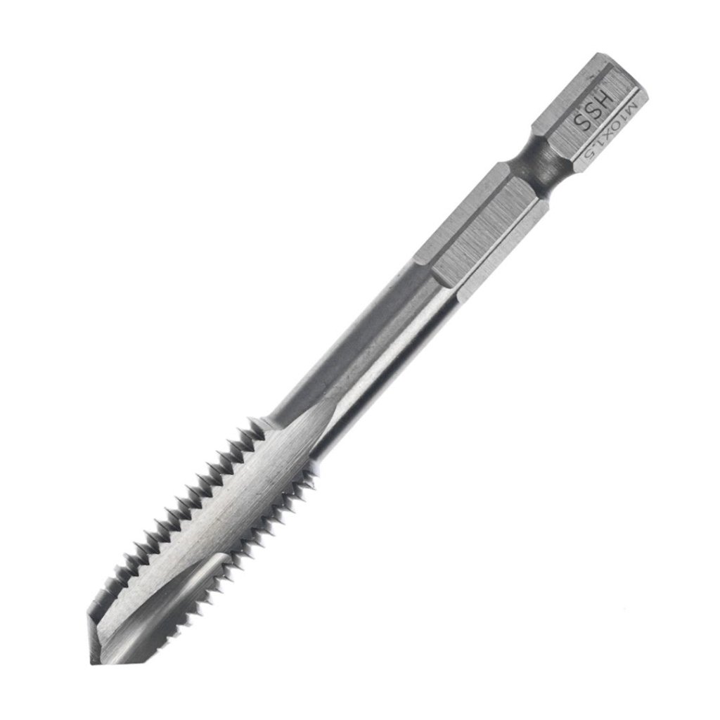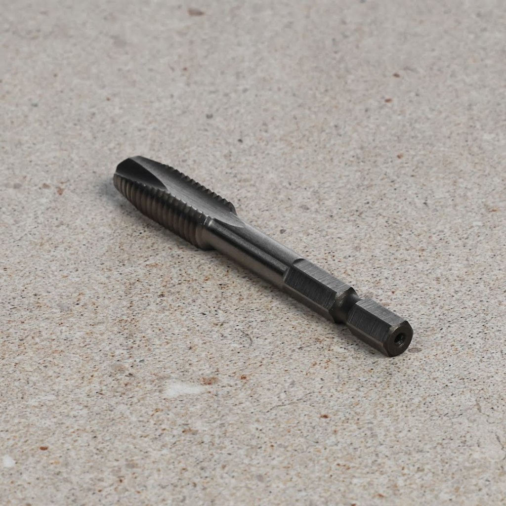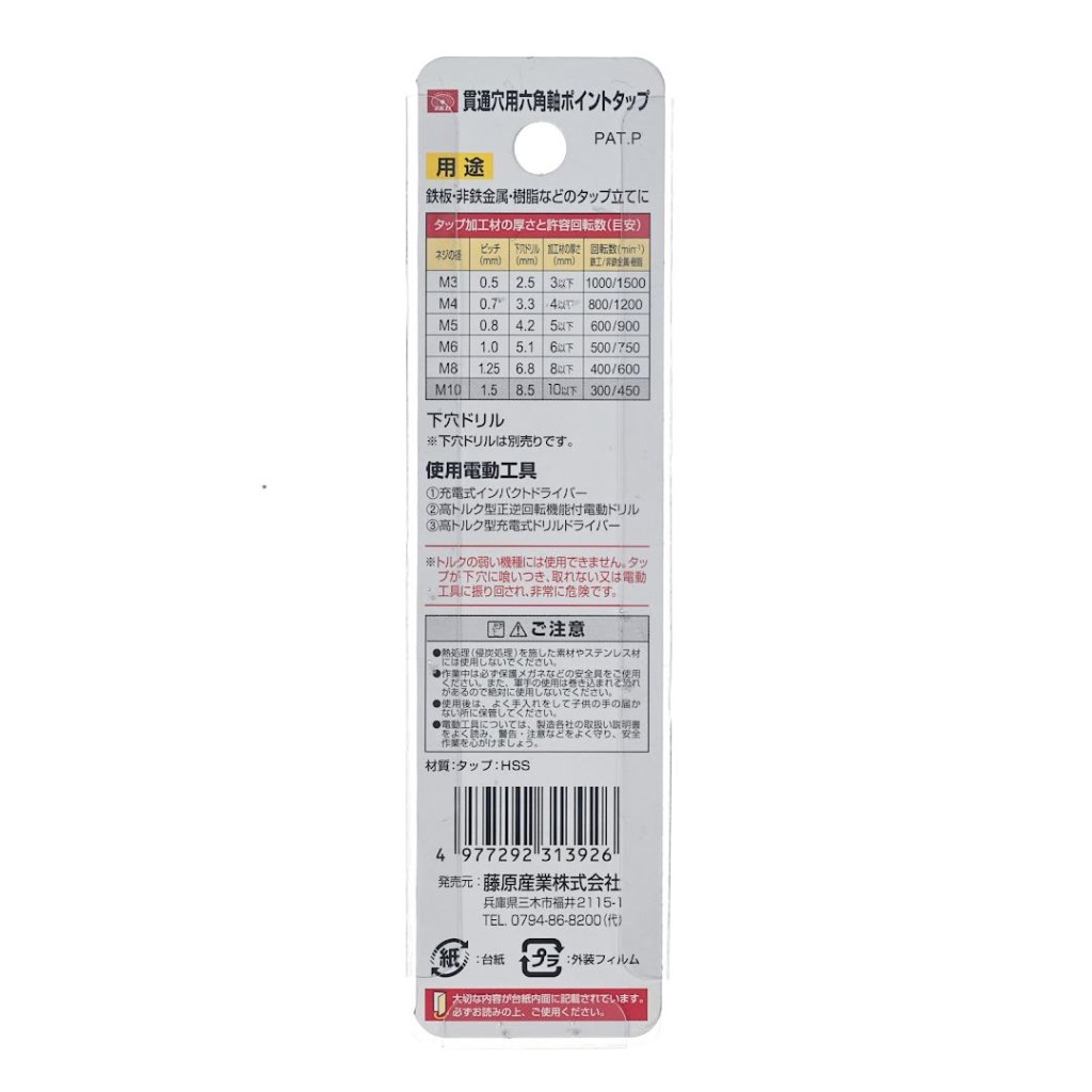 The SK11 Japanese Split Point Drill and Tap Bit is designed for smooth thread cutting with minimal chip clogging, thanks to its precisely processed tip. This hex-shank type bit is perfect for electric tools, ensuring excellent bite at the cutting edge. It is ideal for through-hole applications and requires a pre-drilled hole before threading.