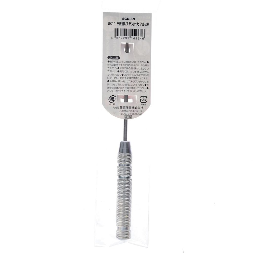 The SK11 Japanese Stainless Steel Scratch Awl, model SGN-6N, is a versatile tool for precise hole-making and marking tasks. It is ideal for wet environments and features a lightweight, durable aluminum handle and a rust-resistant stainless steel needle. With 12 mm in width, 148 mm in height, and 12 mm in depth and weighing only 26.5 g, this scratch awl is easy to handle and perfect for detailed work.