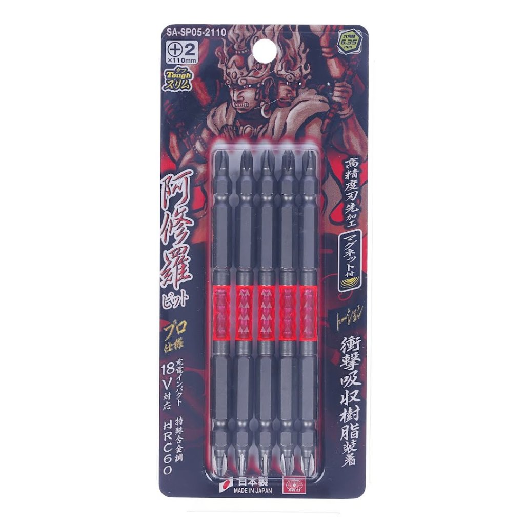 SK11's Japanese Super Ashura durable bits excel in precision fastening with shock-absorbent tech, which is ideal for heavy-duty tasks. Made in Japan.
