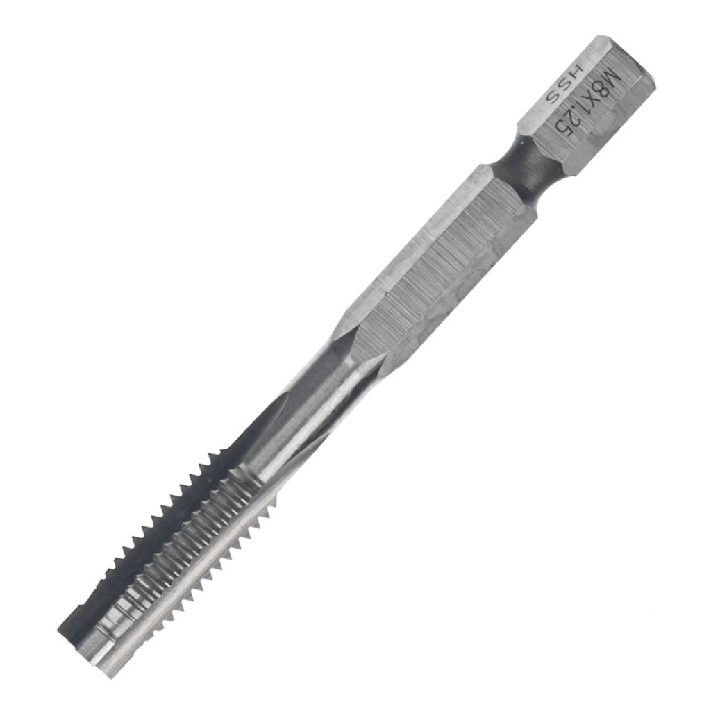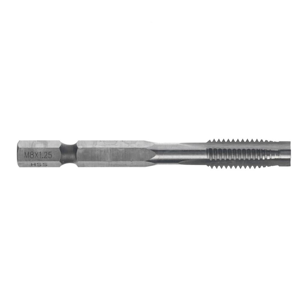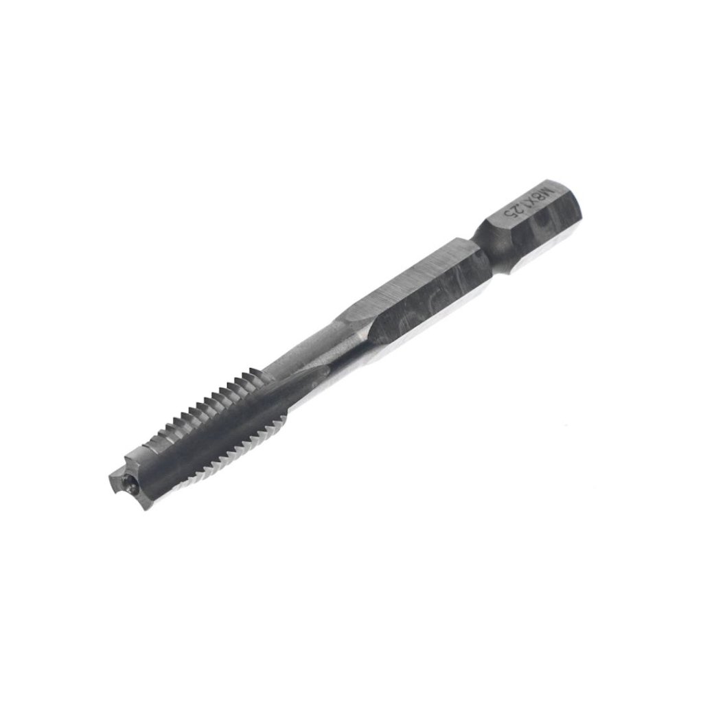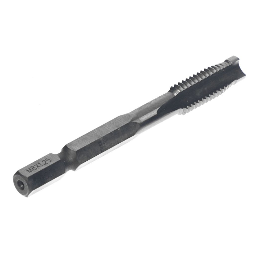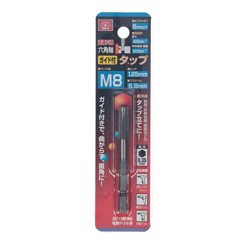 The SK11 Japanese Tap Bit with Guide is designed for precise threading tasks. With a hexagonal shank that fits most power tools, this tap bit ensures stable and accurate threading without bending. It is made explicitly for through-hole applications and has a size of M8 x 1.25 mm. The tool measures 8 mm in width, 72 mm in height, and 8 mm in depth and weighs 18 g. Please ensure to create a pilot hole before threading.