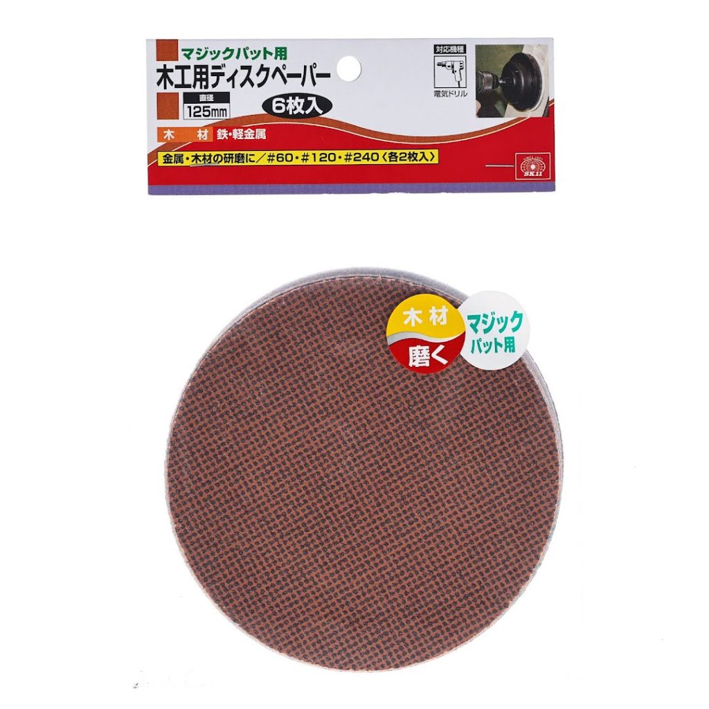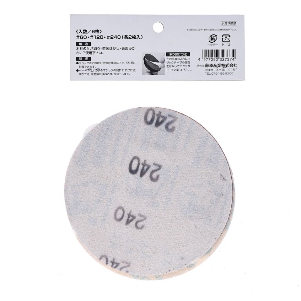 The SK11 Japanese Velcro Sandpaper is ideal for wood deburring, paint removal, and surface polishing. This 125 mm diameter sandpaper set includes six pieces designed for use with electric drills. Featuring a special coating, it offers three times the durability of regular sandpaper and ensures easy grit changes with its Velcro attachment system.