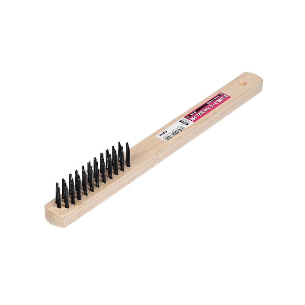 The SK11 Japanese Wire Brush, model No.1, has a wood handle and three rows of wire bristles. It is designed to efficiently remove rust and paint. It measures 22 mm in width, 270 mm in height, 35 mm in depth, and 60 g in weight, making it lightweight and easy to handle.