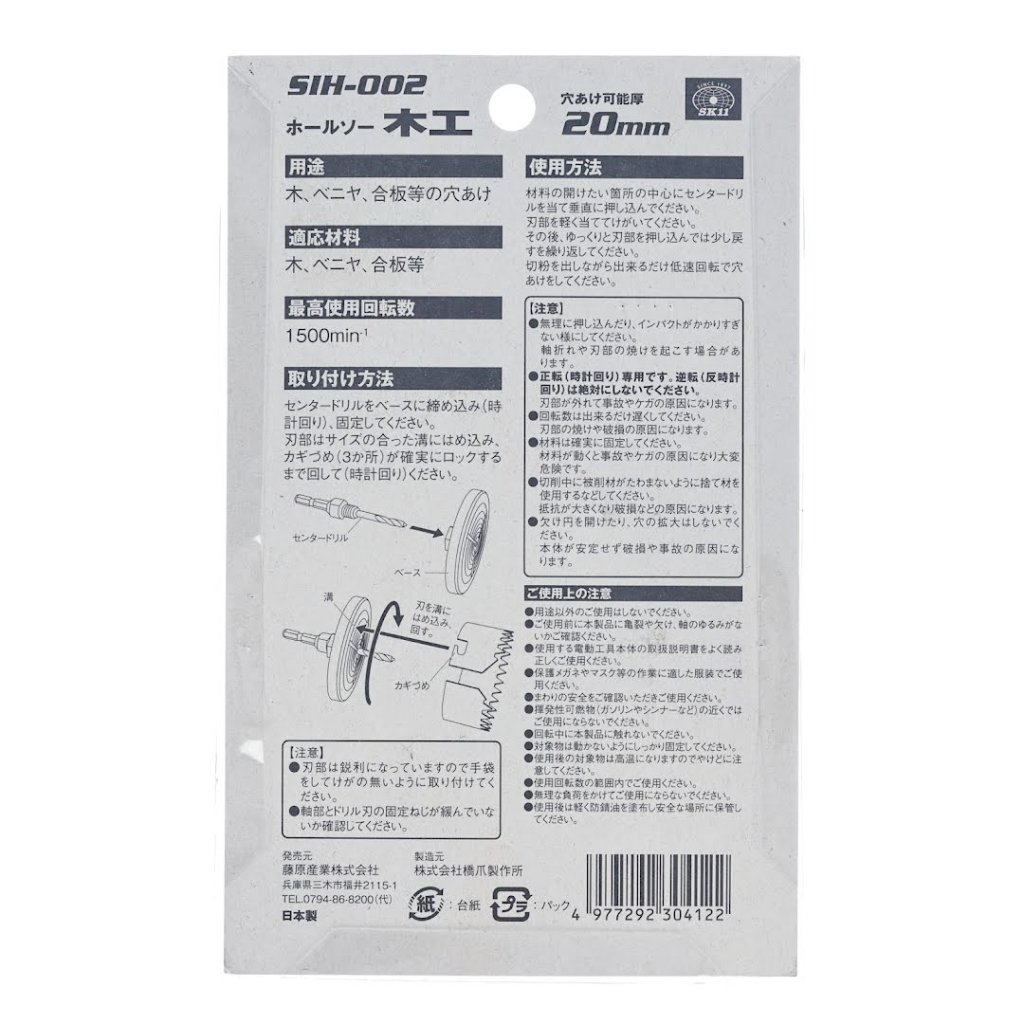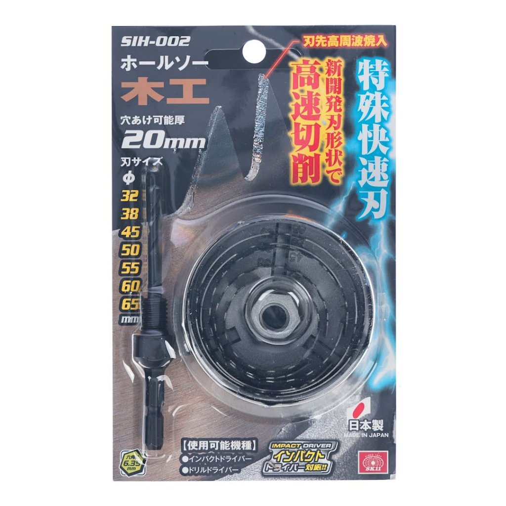 The SK11 Japanese Wood Cutting Hole Saw, model SIH-002, is designed for high-speed cutting with its newly developed blade shape. This versatile tool is ideal for making holes in wood, plywood, and composite boards using an impact or drill driver. It features a 6.35 mm hex shank and offers multiple hole sizes ranging from 32 mm to 65 mm.