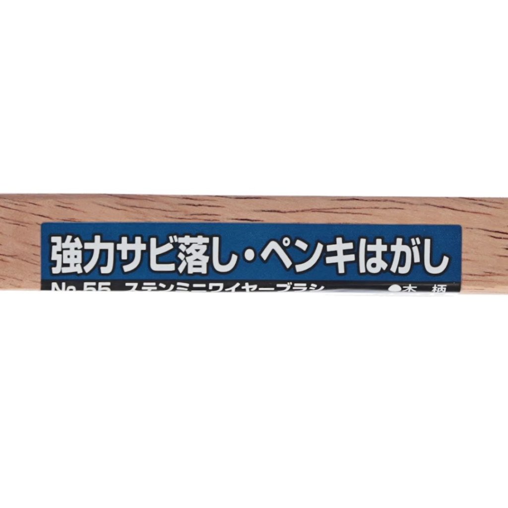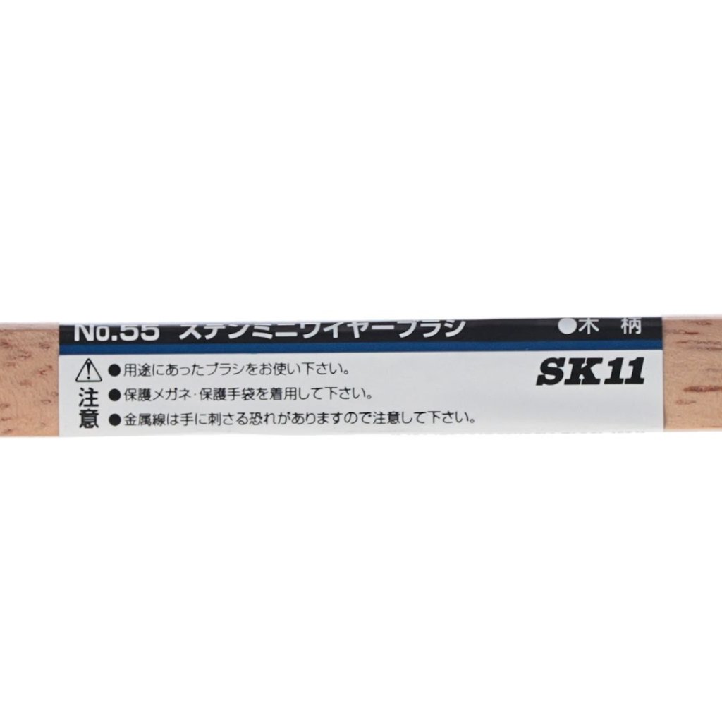 The SK11 Mini Wire Brush, model No.55, is designed for removing rust and paint. Its stainless steel bristles are rust-resistant and ideal for working in wet conditions. Its compact and easy-to-handle design includes a curved wooden handle for comfortable use. It is 14 mm in width, 200 mm in height, and 28 mm in depth, and weighs 21 g.