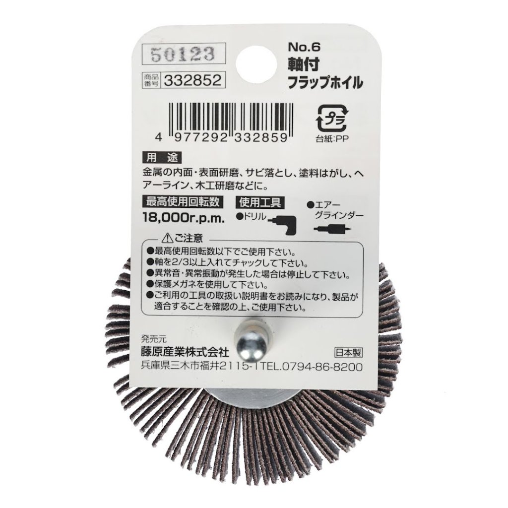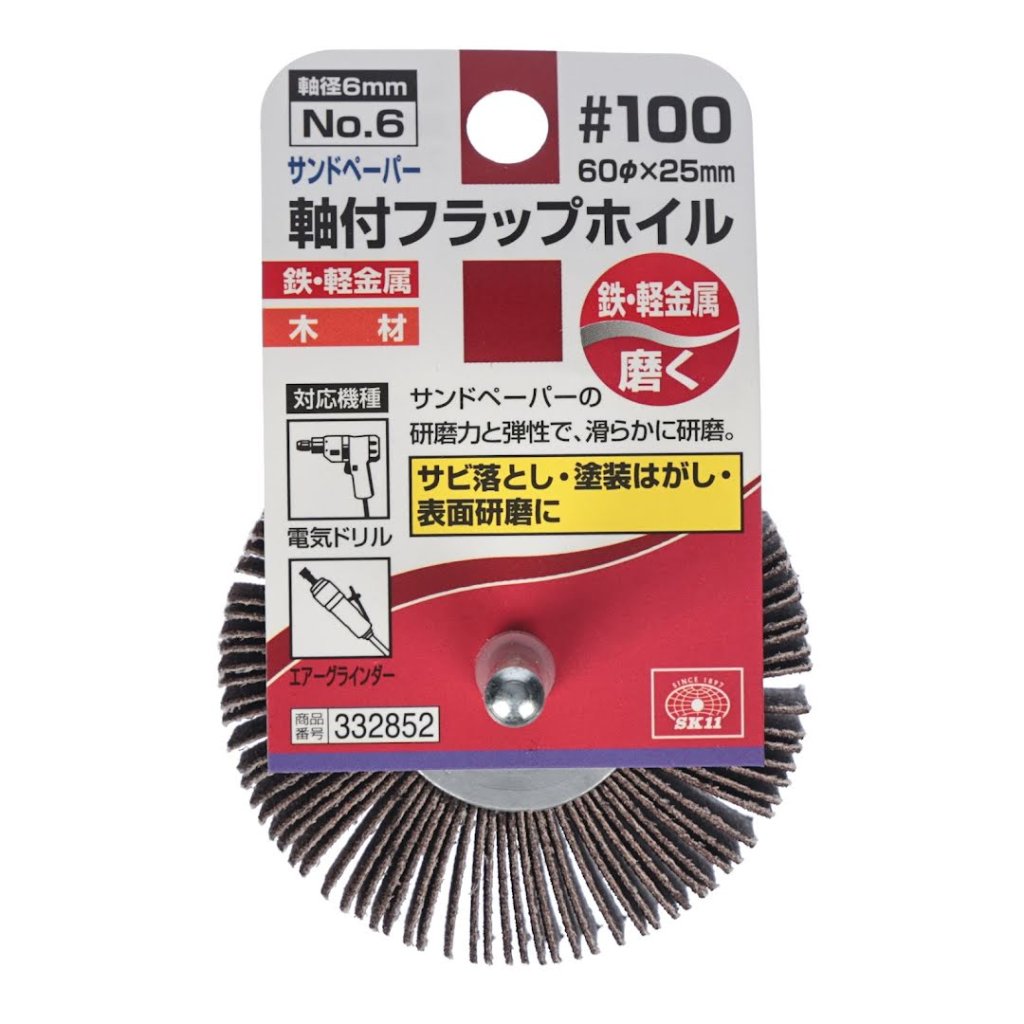 The SK11 Mounted Flap Wheel No.6 is designed to provide smooth finishes with the abrasive power of sandpaper combined with suitable elasticity. Ideal for tasks like metal interior and surface polishing, rust removal, paint stripping, and woodworking, this versatile tool is a must-have. With a 6 mm shaft diameter and a #100 grit size, it fits electric drills and air grinders and operates safely under 18000 RPM.