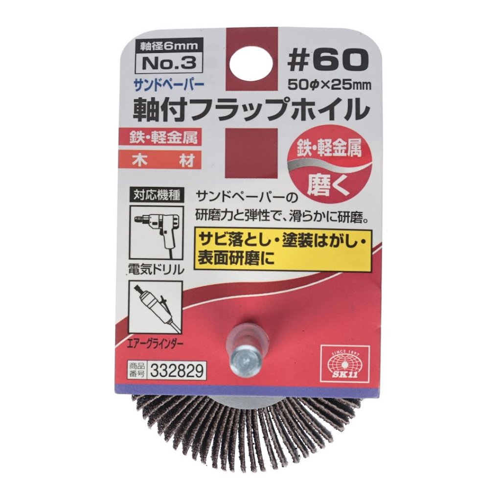 The SK11 Mounted Flap Wheel No.3 offers excellent performance for metal surface polishing, rust removal, and paint stripping. With a 6 mm shank diameter and #60 grit, it is designed for use with electric drills and air grinders. It features a 50 mm diameter and a 25 mm width and operates at a maximum speed of 4000 RPM for optimal results.