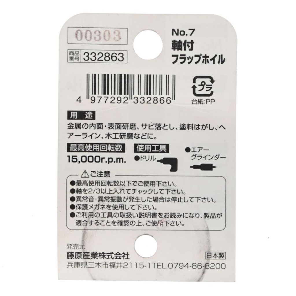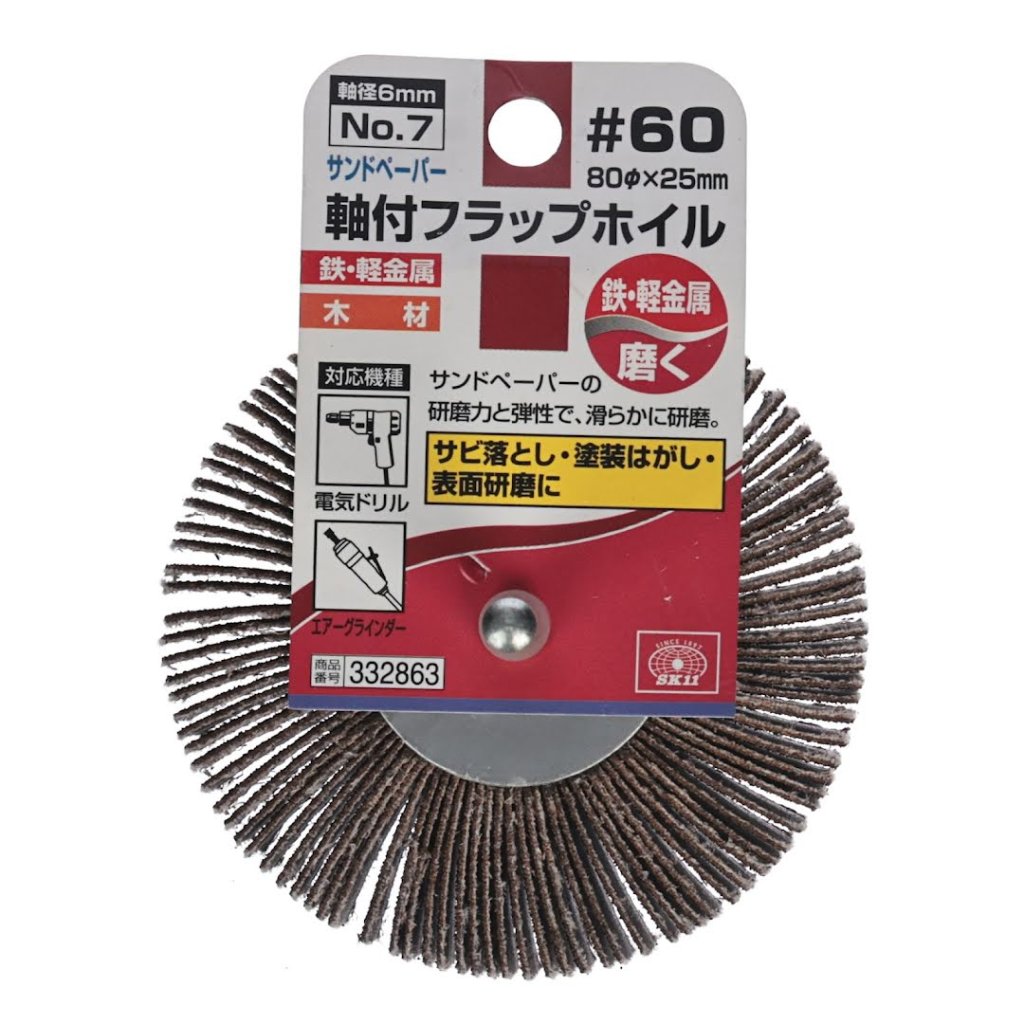 The SK11 Mounted Flap Wheel No.7 is designed to provide smooth polishing with the combined power of sandpaper and appropriate elasticity. Ideal for metal surface finishing, rust removal, and paint stripping, this versatile tool also excels in woodworking applications. The flap wheel features a 6 mm shaft diameter, 80 mm diameter, and a grit of #60, with a maximum operating speed of 15000 RPM, making it compatible with electric drills and air grinders.