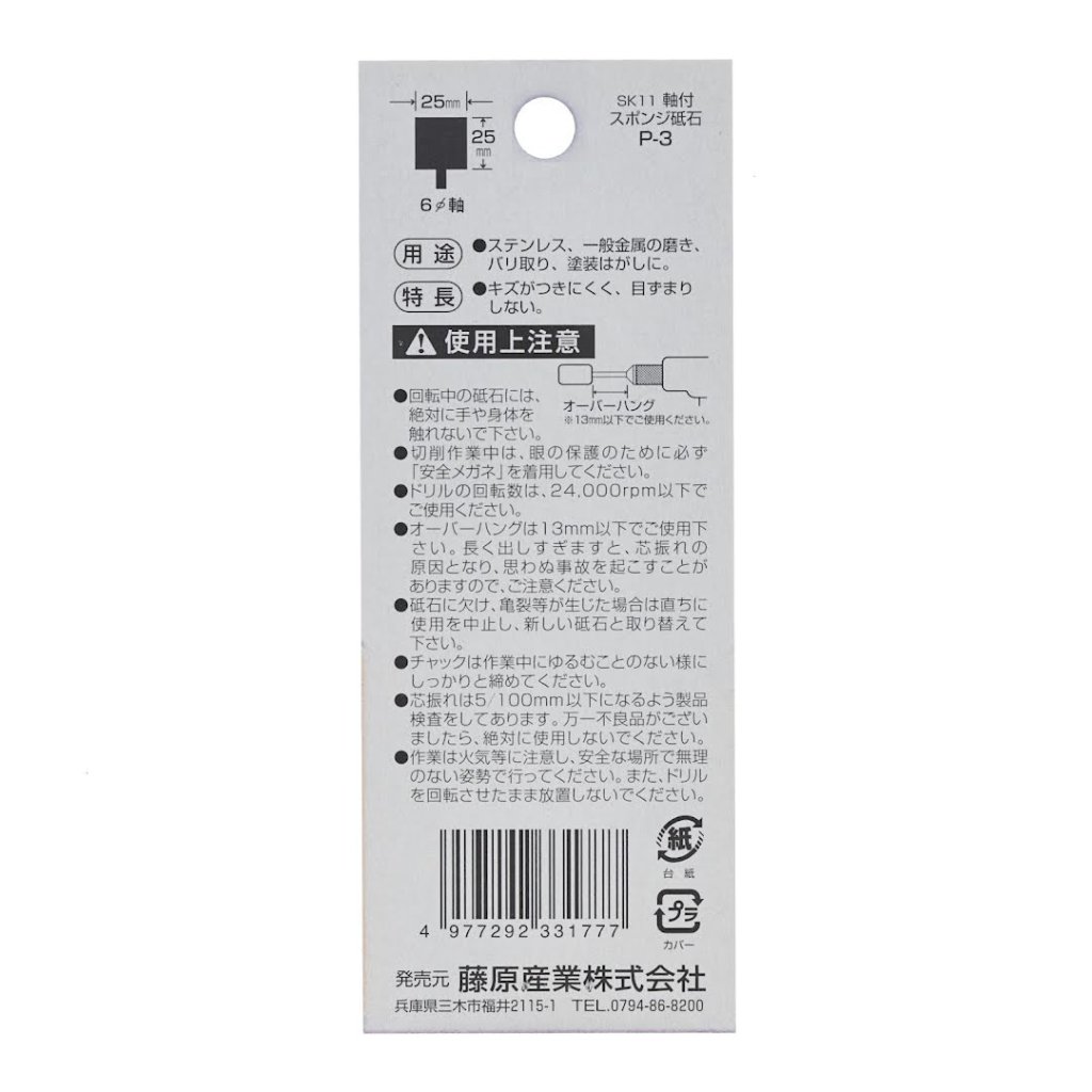 The SK11 Mounted Sponge Abrasive P-3 is a versatile tool for polishing stainless steel, iron, and light metals. With a shaft diameter of 6 mm and WA80P grit, it is perfect for use with electric drills. This sponge abrasive measures 25 mm in width and length, ensuring it is gentle and less likely to scratch surfaces. It is ideal for deburring and paint removal, using an overhang of less than 13 mm, and a drill rotation speed under 24000 RPM is recommended.