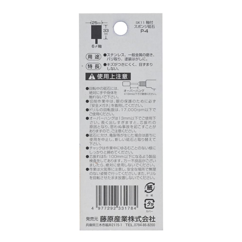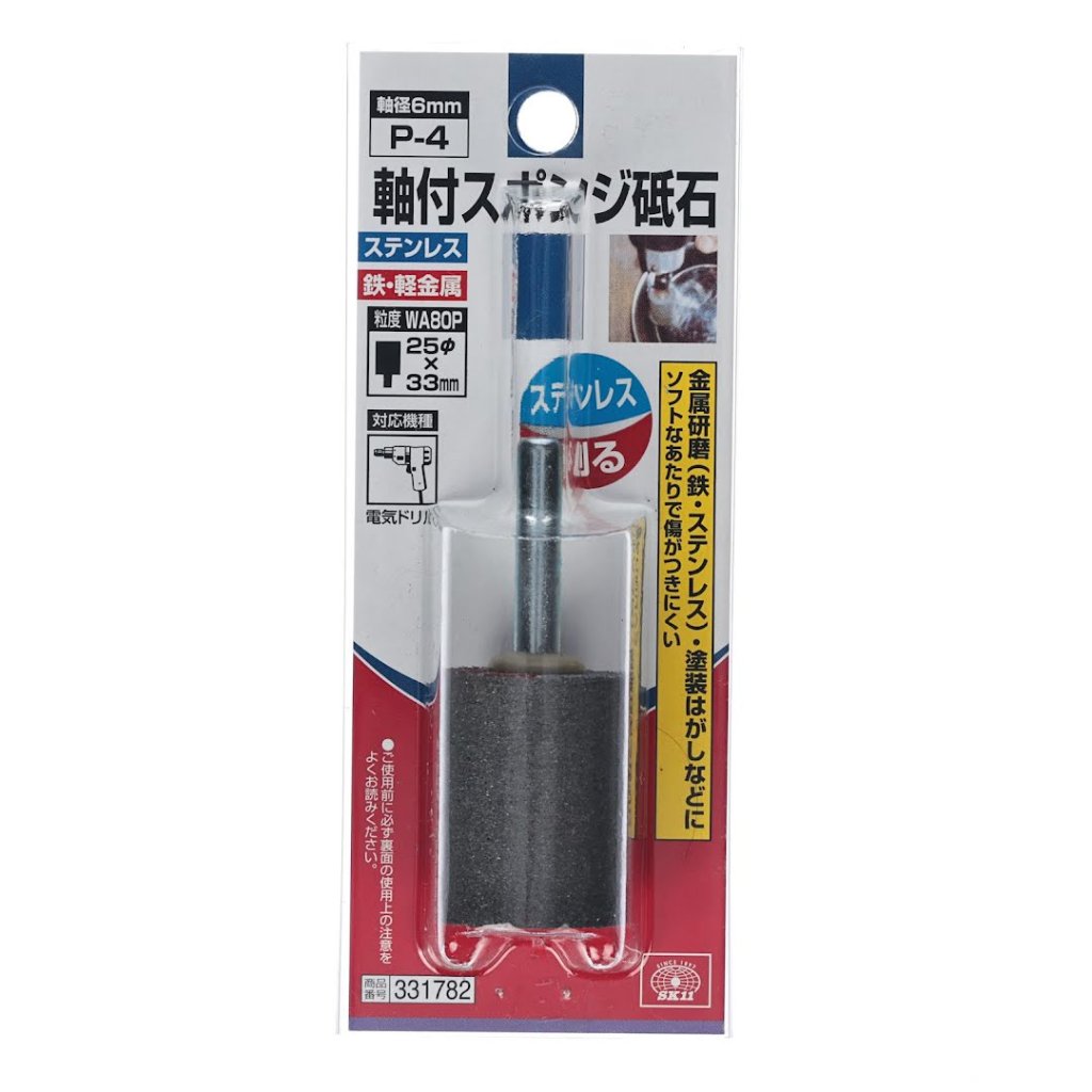 The SK11 Mounted Sponge Abrasive P-4 is a versatile tool for polishing, deburring, and paint removal on stainless steel, iron, and light metals. This product features a shaft diameter of 6 mm and a grit size of WA80P, making it ideal for use with electric drills. Measuring 25 mm in width and 60 mm in height, it ensures a soft touch that minimizes the risk of scratches. For optimal performance, use a drill rotation speed below 17000 RPM.