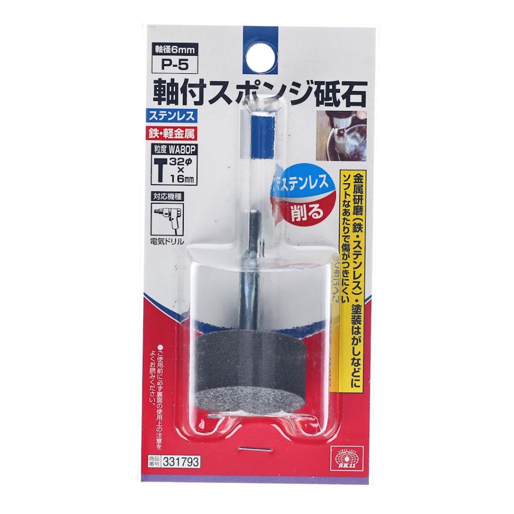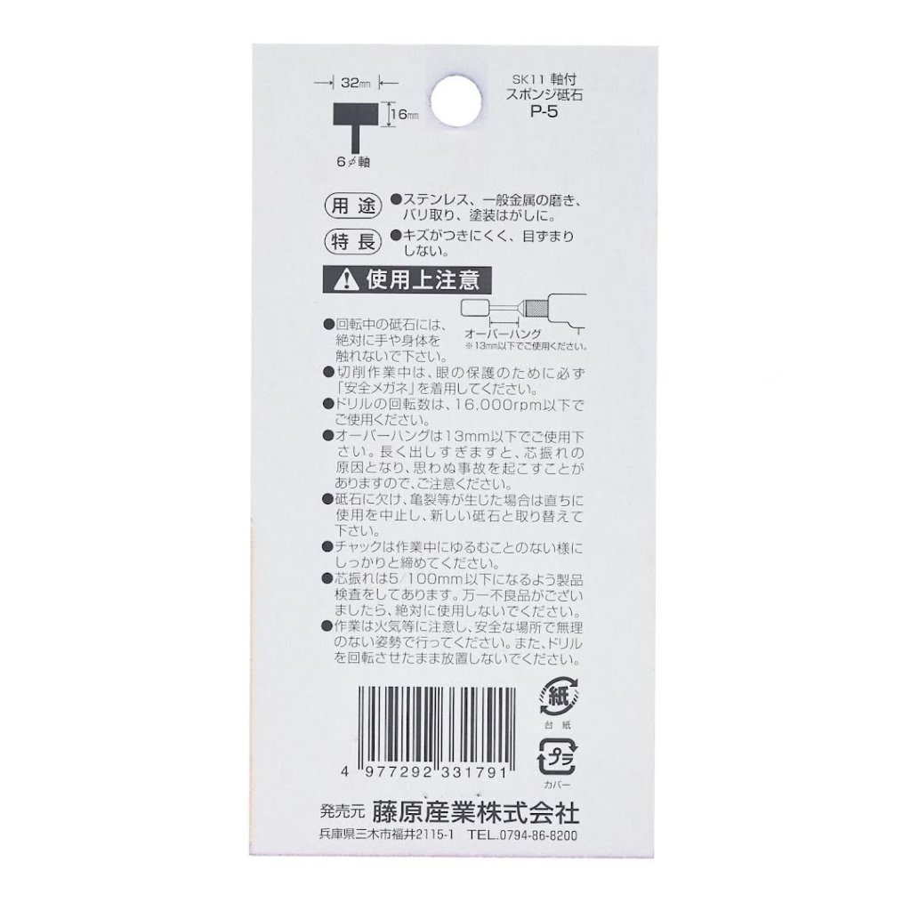 The SK11 Mounted Sponge Abrasive P-5 is a versatile tool for polishing and deburring stainless steel, iron, and light metals. This shaft-mounted sponge abrasive is ideal for electric drills, featuring a soft touch that minimizes scratches. With a shaft diameter of 6 mm and grit size WA80P, it ensures efficient and smooth finishing. Suitable for various applications, including paint removal, it measures 33 mm in width and 55 mm in height and weighs 40 g. For optimal performance, maintain drill speeds below 16000 RPM and keep an overhang below 13 mm.