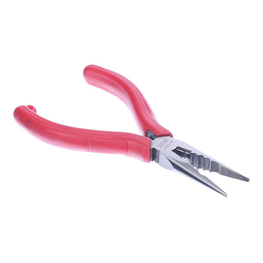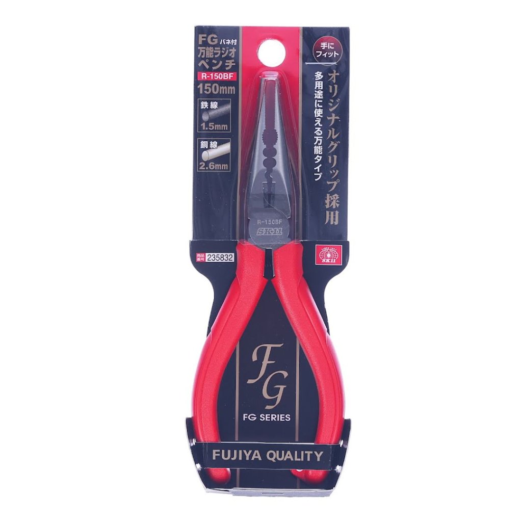 The SK11 Multi Purpose Needle-Nose Combination Pliers, model R-150BF, is a versatile tool designed for various applications, including cutting, gripping, and crimping. Its dimensions are 55 x 16 x 15 mm, weighing 130 g, making it compact and lightweight for easy handling. This plier excels in cutting through iron wires up to 1.5 mm and copper wires up to 2.6 mm, thanks to its heat-treated blades with a hardness of HRC 57-61. The original grip fits comfortably in the hand, ensuring superior operability and reducing fatigue during extended use. Ideal for wiring in tight spaces, bending, and cutting tasks, it's a must-have for any professional toolkit.