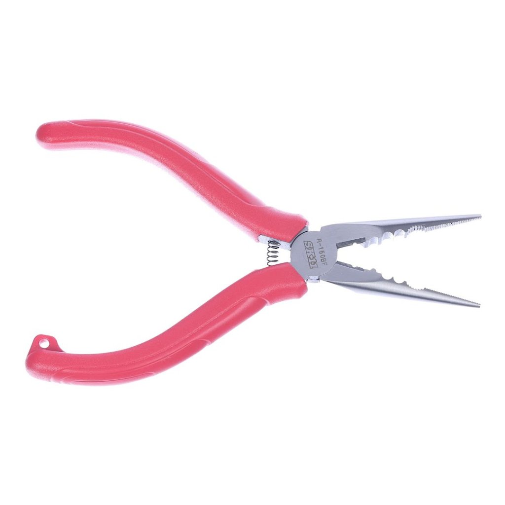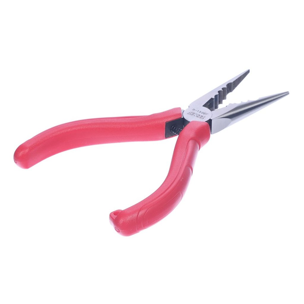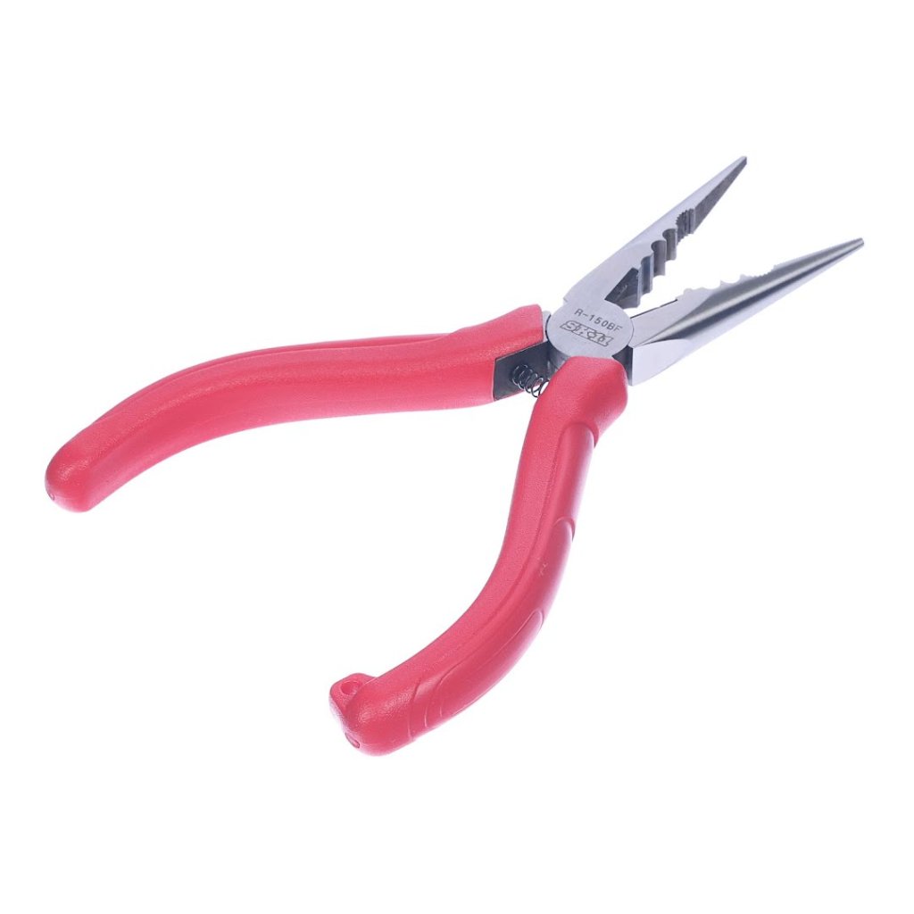 The SK11 Multi Purpose Needle-Nose Combination Pliers, model R-150BFH, is an indispensable tool for versatile applications, including cutting, gripping, and crimping. Its compact dimensions (55 x 160 x 15 mm, weight 130 g) make it perfect for working in tight spaces. Equipped with a spring mechanism for ease of use and an original grip design that ensures a comfortable fit in the hand, enhancing work efficiency. The plier's cutting capability is optimized for iron wire up to 1.5 mm and copper wire up to 2.6 mm, with the cutting edges undergoing a non-oxidizing heat treatment for durability.