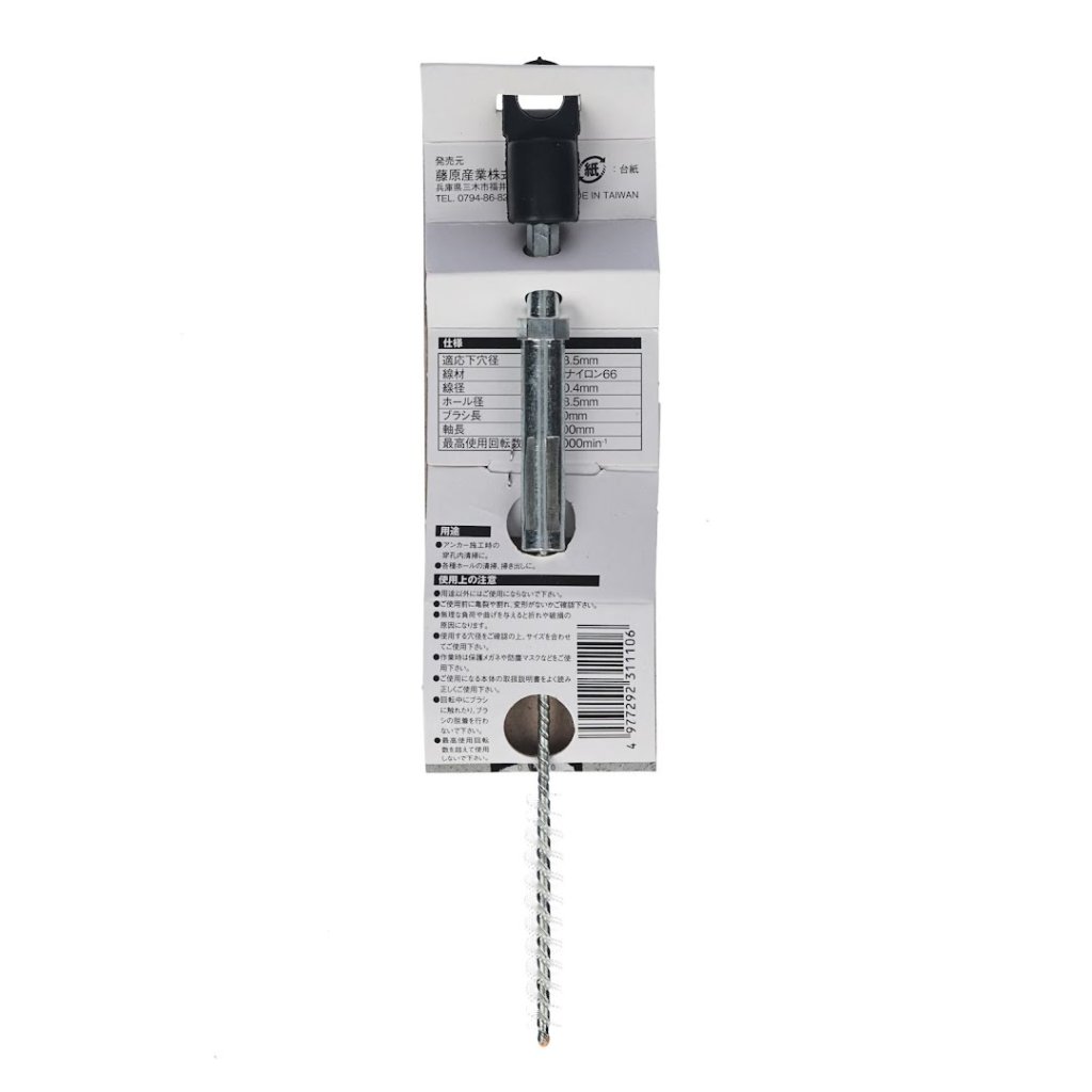 The SK11 Nylon Wire Tube Brush, model FAN-085, is designed to efficiently clean anchor holes and various pipes. It can be used with an impact driver for rotational cleaning. Featuring a hole diameter of 8.5 mm and a brush length of 50 mm, it ensures thorough cleaning in minimal time. The shaft length of 100 mm and the 6.35 mm hexagonal shaft are compatible with standard drivers. It is suitable for a maximum rotational speed of 1000 RPM.