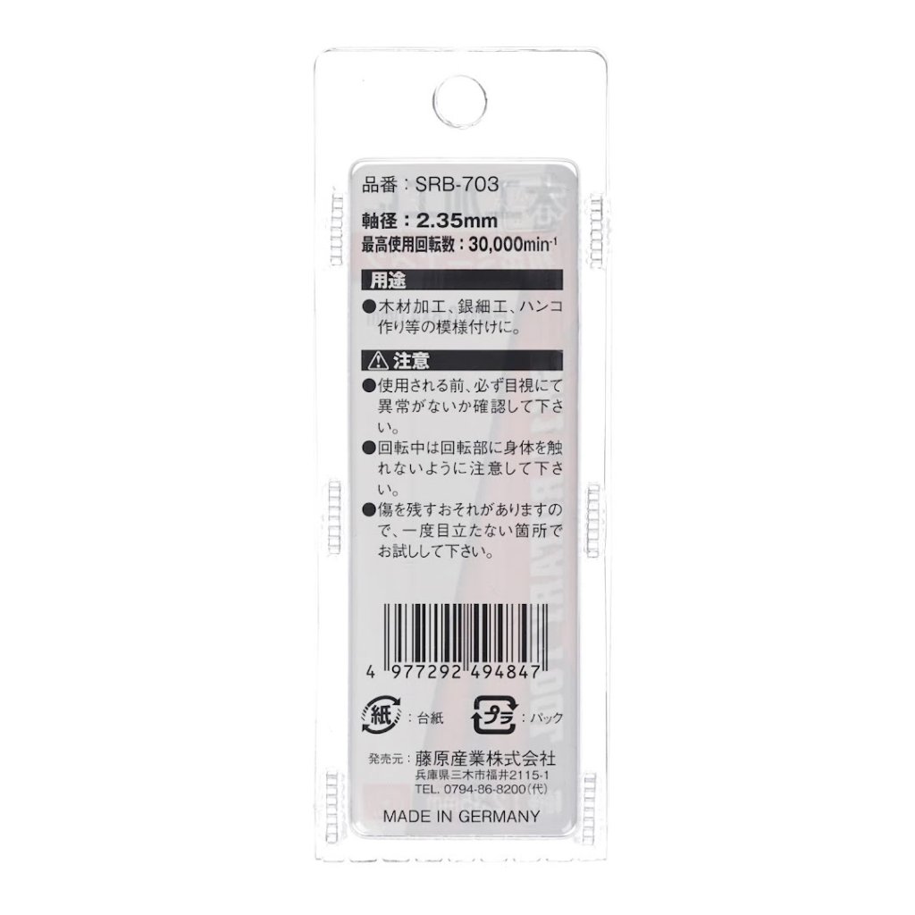 The SK11 Precision Rotary Burr, model SRB-703, is an ideal tool for fine woodworking, silver crafting, and stamp making. This precision rotary burr features a pointed cone shape with dimensions of 0.8 x 4.0 mm, mounted on a 2.35 mm shank. It is suitable for detailed grinding on models and wooden items and supports a maximum rotation speed of 30000 RPM.