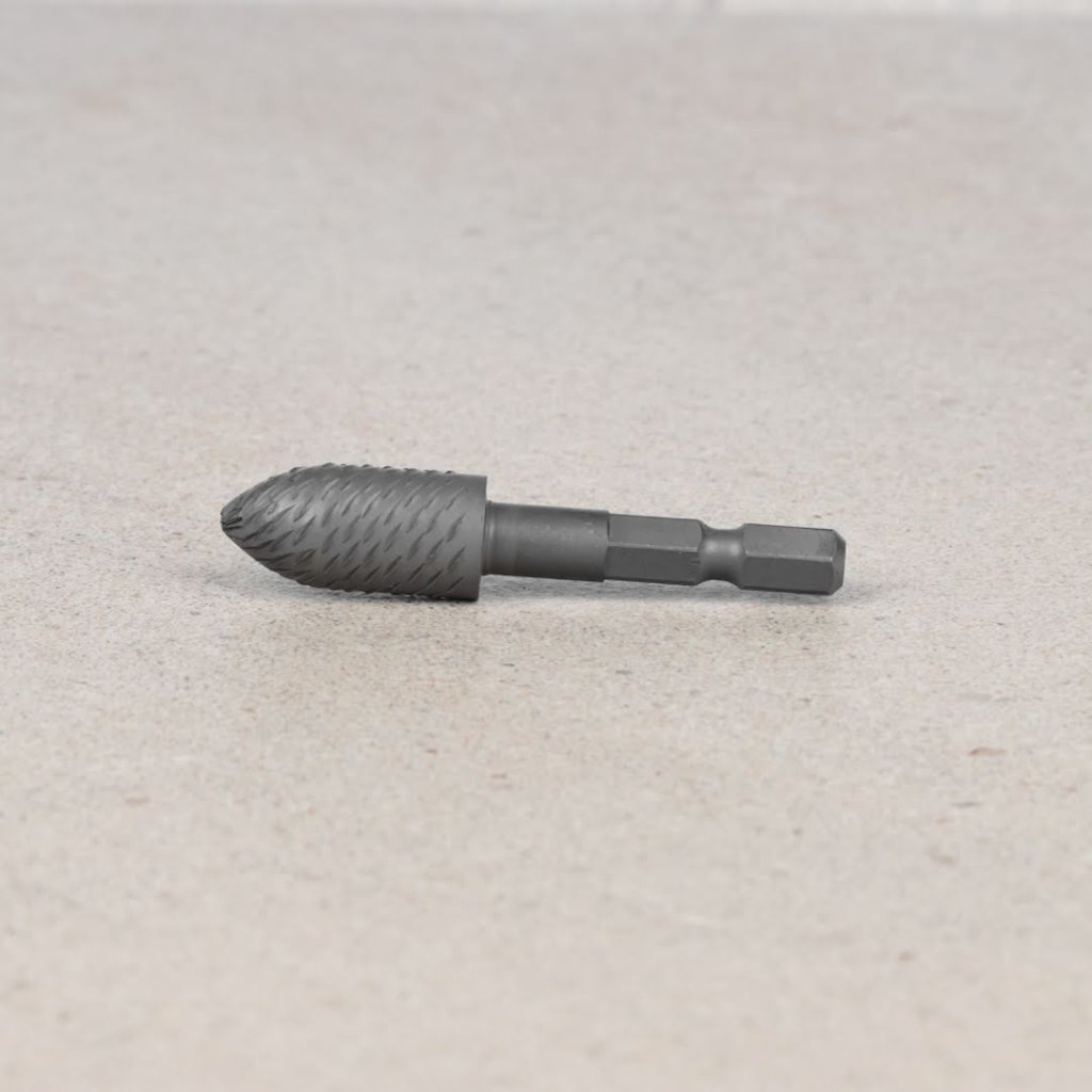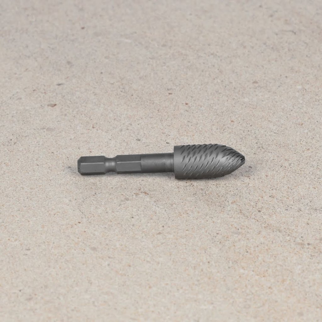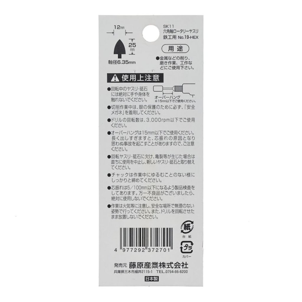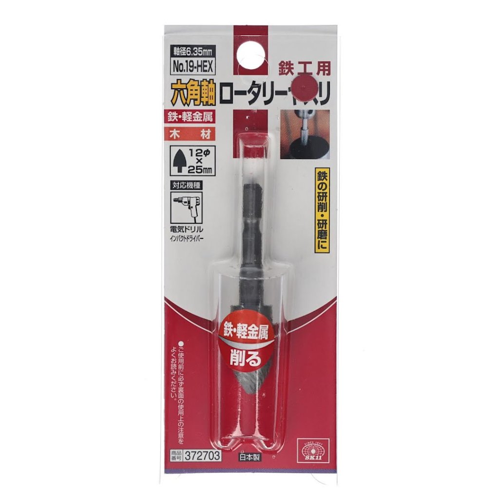 The SK11 Pointed Tree Rotary Burr, model No.19-HEX, is perfect for grinding and polishing metal. Its 6.35 mm hex shank can be easily attached to an impact driver for quick use. Measuring 12 x 25 mm, it is suitable for electric drills and impact drivers. Ensure the drill rotation speed does not exceed 3000 RPM for optimal performance.