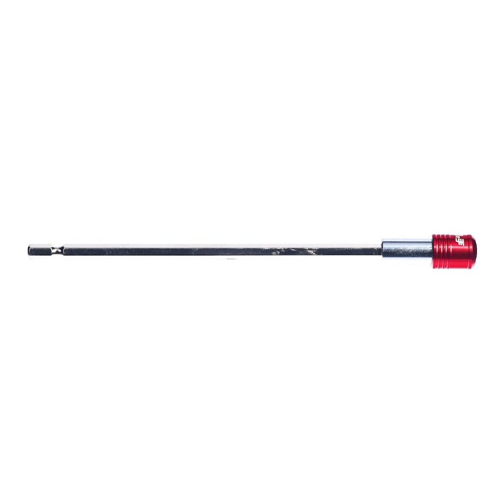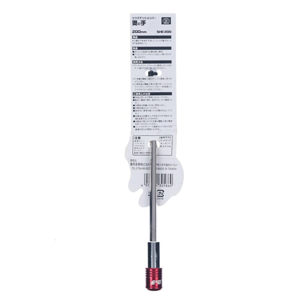 The SK11 Quick Release Bit Extension, model SHE-200, is designed for extending reach in tight and recessed areas during screw fastening. Measuring 200 mm long and weighing just 70 g, it is perfect for use when the main body interferes, and the bit cannot reach. The one-touch quick chuck allows for easy bit attachment, making it highly convenient when you need more extension. Compatible with 40 V cordless impact drivers, this extension bar is essential for any DIY enthusiast or professional.