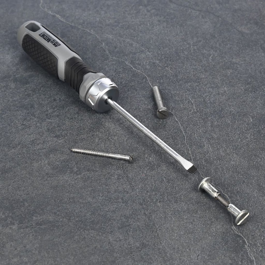 The SK11 Ratchet Screwdriver, model No.900, is a versatile tool designed for both tightening and loosening screws. This ratchet screwdriver features an adjustable mode switch, allowing it to function as a standard screwdriver or in ratchet mode for efficient repetitive tasks. The tool's dimensions are 30 mm in width, 210 mm in height, and 30 mm in depth, with a weight of 85 g, making it lightweight and easy to handle. The screwdriver has a shaft length of 100 mm and a slotted head size of 5 mm, which is ideal for various DIY projects.