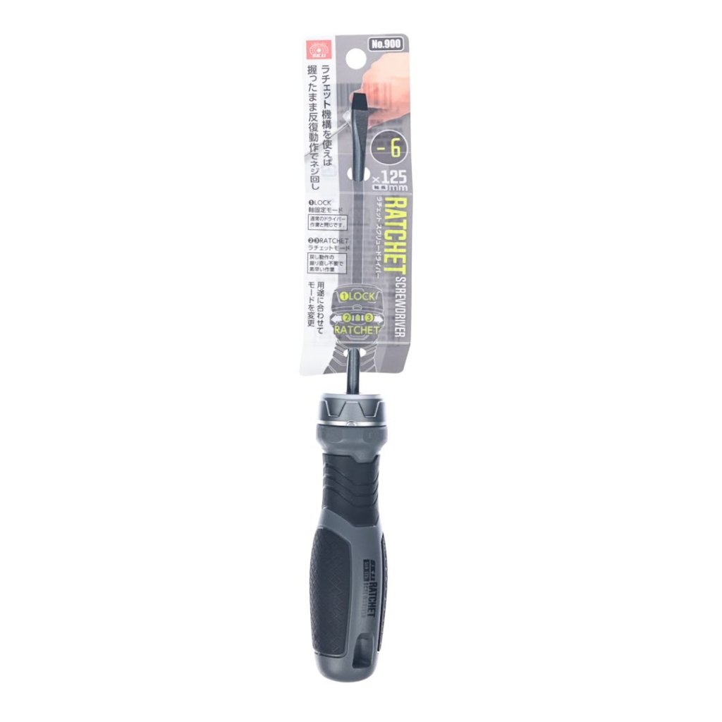 The SK11 Ratchet Screwdriver, model No.900, is a versatile tool that functions as a standard screwdriver and a ratchet driver. With a shaft length of 125 mm and a 6mm flathead, it is designed for both tightening and loosening screws. This screwdriver offers a ratchet mode for efficient screw driving with repetitive motion and a fixed shaft mode for use as a traditional screwdriver. The tool's compact size (34 mm width, 245 mm height, 34 mm depth) and lightweight design (122 g) ensure ease of use and portability.