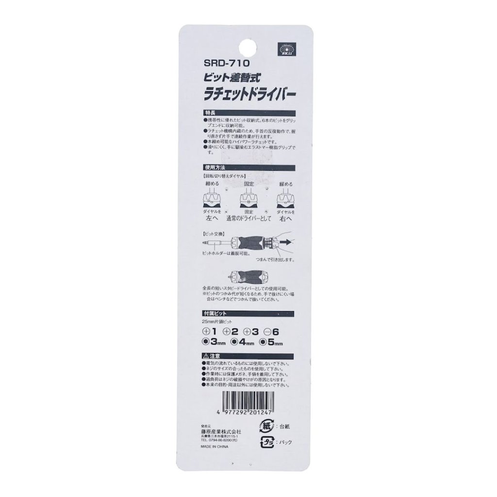 The SK11 Ratchet Screwdriver, model SRD-710, is a versatile tool designed for efficient tightening and loosening of screws. Featuring a built-in ratchet mechanism, it allows for continuous one-handed operation without the need to adjust your grip. The high-power ratchet ensures secure fastening, while the ergonomic elastomer resin grip provides a comfortable and non-slip hold. Compact and portable, this screwdriver also conveniently stores bits within the handle.