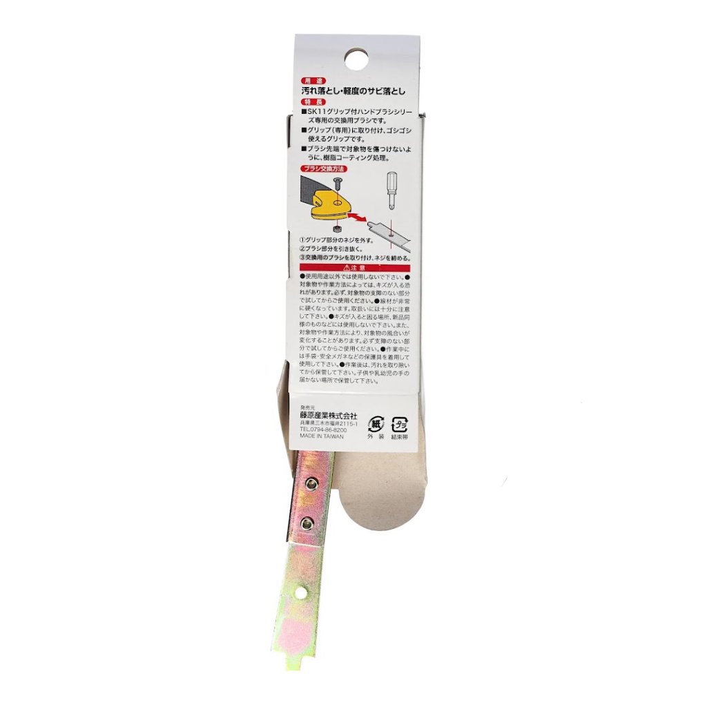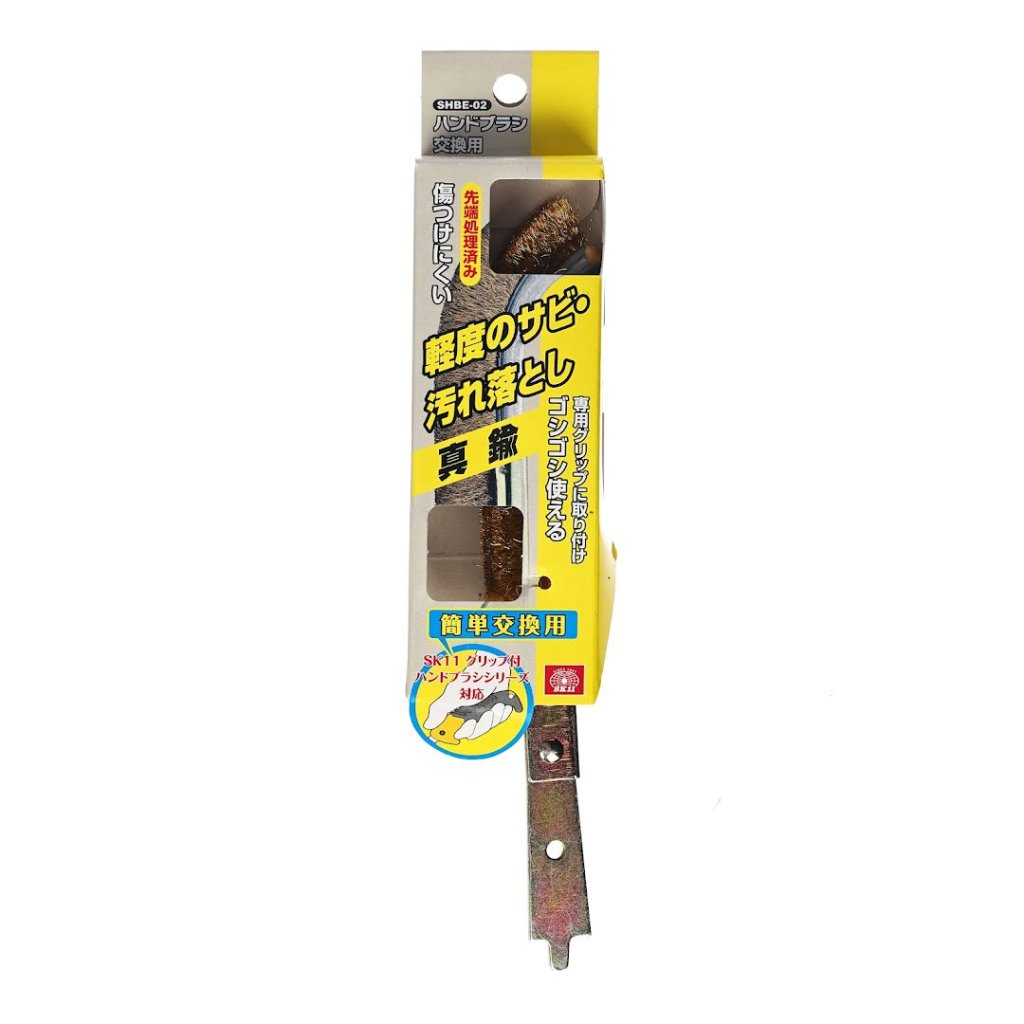 The SK11 Replacement Wire Brush, model SHBE-02, is a specialized replacement part for the SHB series hand brushes, designed for easy grip and powerful cleaning. Ideal for removing light rust and dirt, this brush features resin-coated bristles to prevent damage to surfaces. A brush length of 95 mm and 0.13 mm diameter bristles enhance work efficiency while being gentle on the material. Dimensions: 35 x 80 x 15 mm, weight: 49 g.