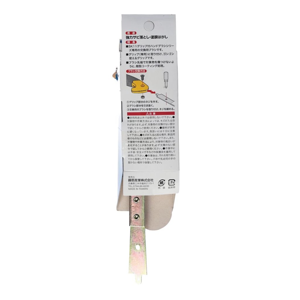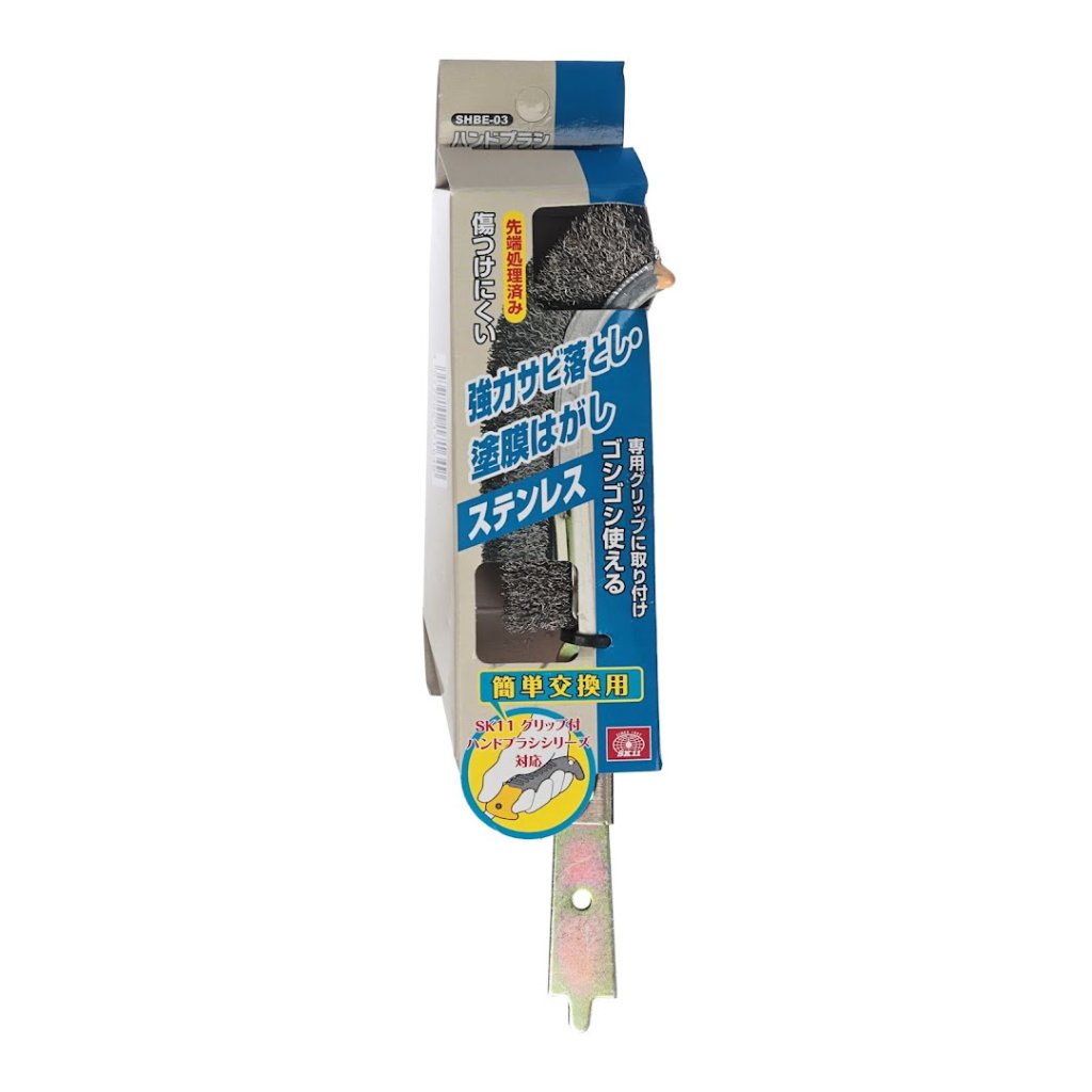 The SK11 Replacement Wire Brush, model SHBE-03, is a convenient replacement part for SHB series hand brushes, designed to make tough rust and paint removal tasks easier. Featuring a grip handle, this brush is part of the SHB series and comes with a resin-coated tip to prevent surface damage. The brush itself is densely packed to enhance work efficiency. The brush measures 95 mm with a wire diameter of 0.2 mm.