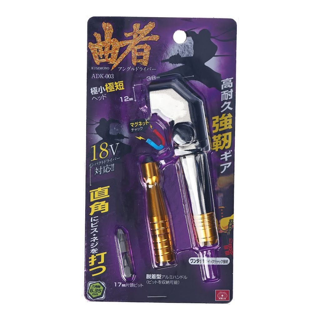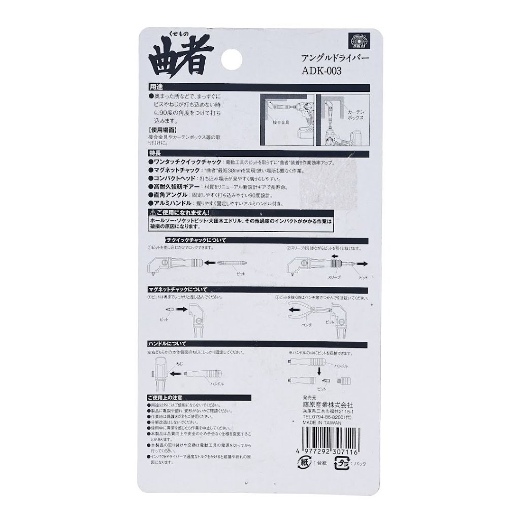 The SK11 Right Angle Drill Attachment, model ADK-003, is designed for precise screw and bolt insertion in tight spaces at a 90-degree angle. With a compact size of 33 mm width, 118 mm height, 106 mm depth, and weighing just 268 g, it is ideal for installing joinery fittings and curtain boxes. This tool features a high-durability gear system for an extended lifespan, and the magnetic chuck allows for easy operation in confined areas. A one-touch quick chuck enhances work efficiency by enabling quick attachment to electric tools without removing bits.