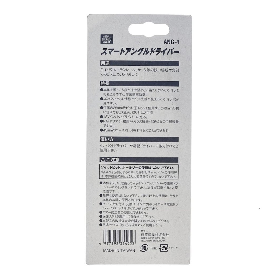 The SK11 Right Angle Attachment, model ANG-4, is a slim, lightweight, angled screwdriver designed for easy use in tight and narrow spaces. Ideal for tasks such as fastening screws in railings, curtain rods, and window frames, this tool features one of the shortest head lengths in the industry at 40 mm. The package includes a 25 mm single-ended bit, making it a versatile addition to your toolkit.