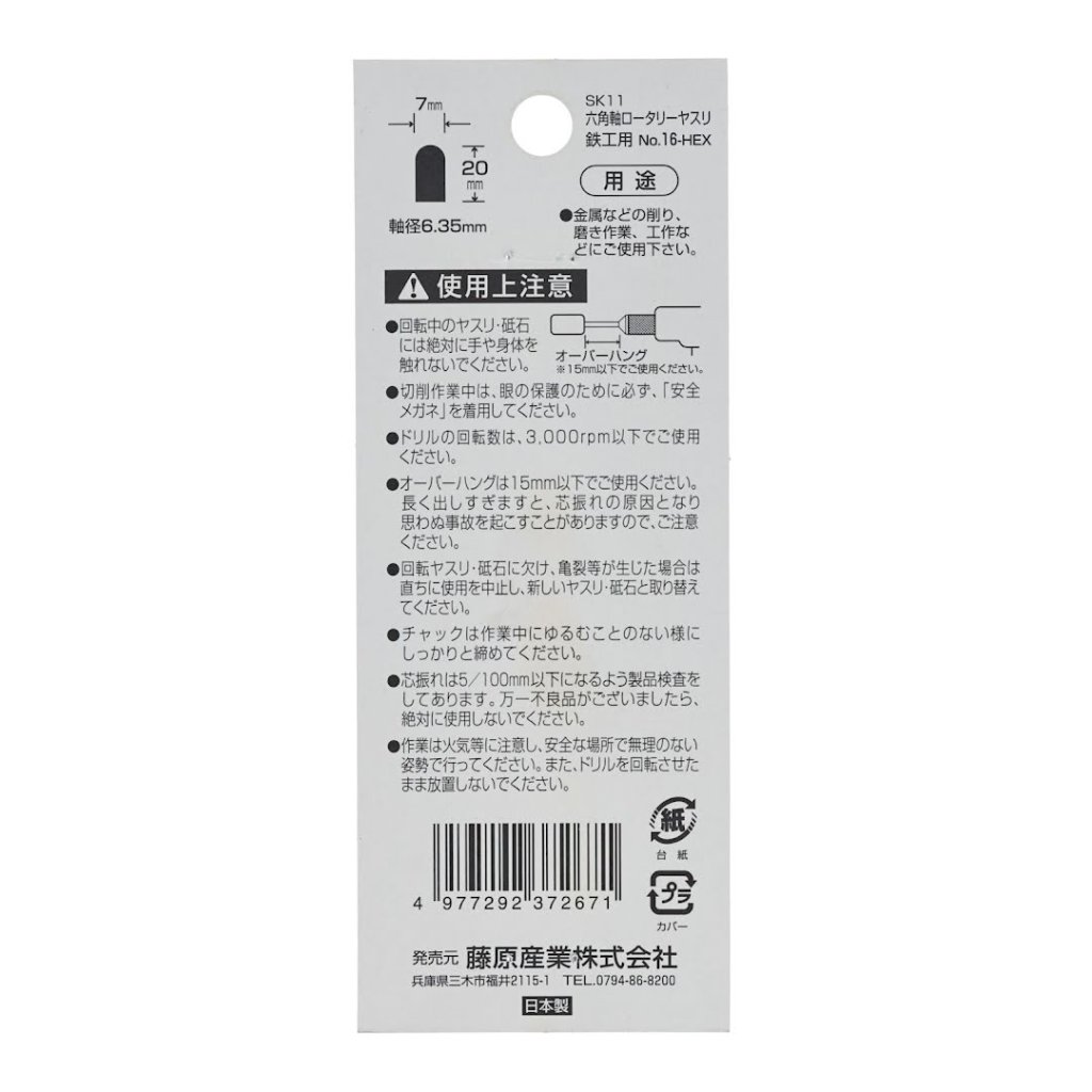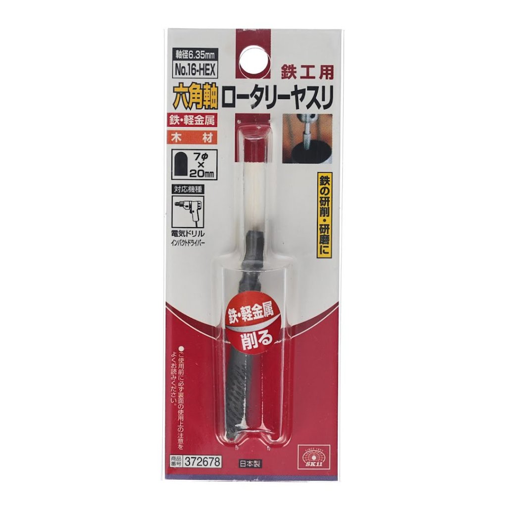 The SK11 Round Head Cylinder Rotary Burr, model No.16-HEX, is an essential tool for grinding and polishing metal surfaces. With a 6.35 mm hex shaft, it easily attaches to impact drivers. The burr is designed for use with electric drills and impact drivers operating at 3000 RPM or less. Its compact size (7 x 20 mm) ensures precision in detailed work.