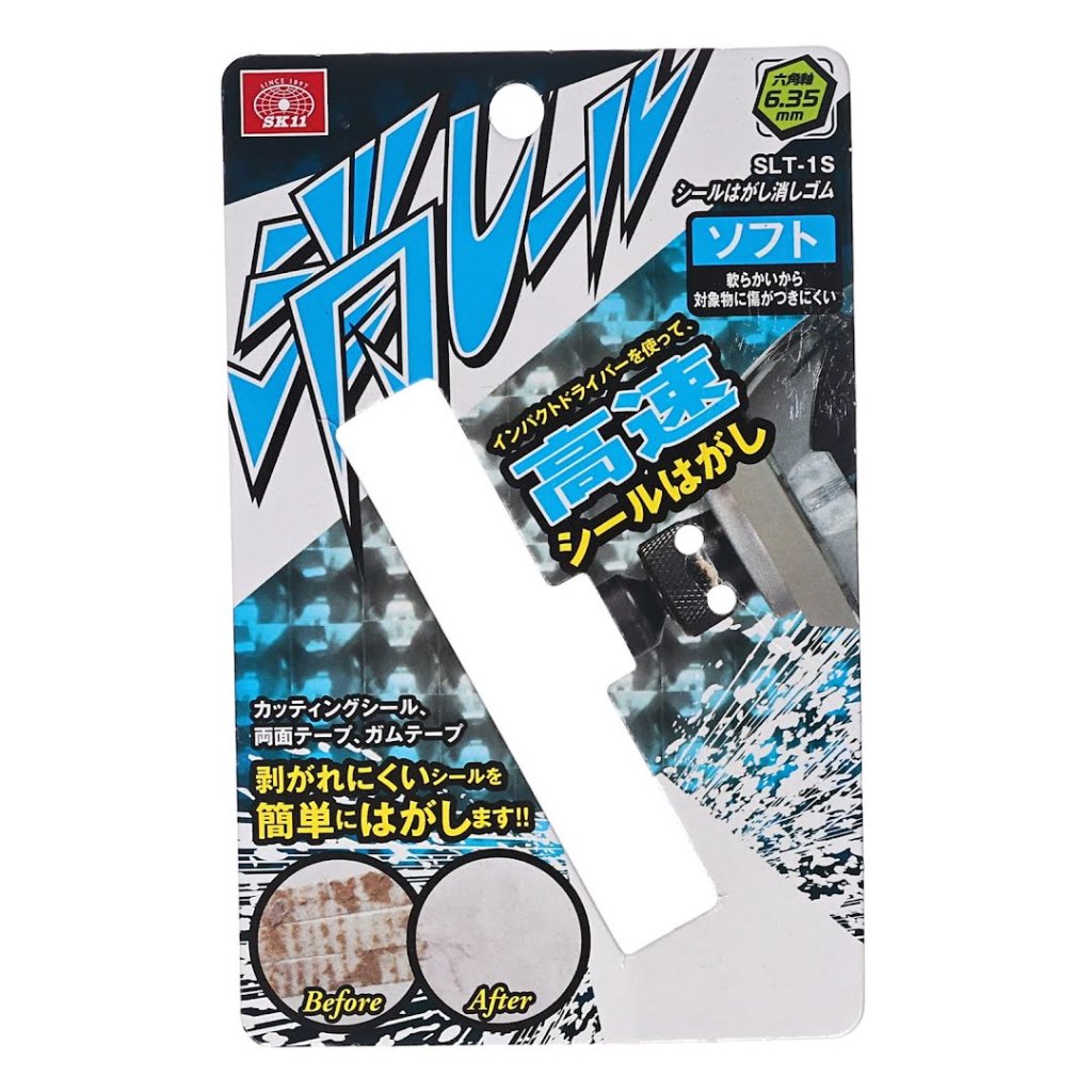 The SK11 Rubber Eraser Wheel, model SLT-1S, makes removing stubborn labels and adhesives quick and efficient. This soft-type wheel is designed to prevent damage to underlying surfaces, ensuring even beginners can use it safely. It easily attaches to impact and drill drivers with a 6.35 mm hex shank, offering convenience and ease of use. Ideal for removing labels, stickers, and adhesive residues, the SK11 Rubber Eraser Wheel is a versatile tool for various materials like metal and reinforced glass. Be sure to test on an inconspicuous area before use.