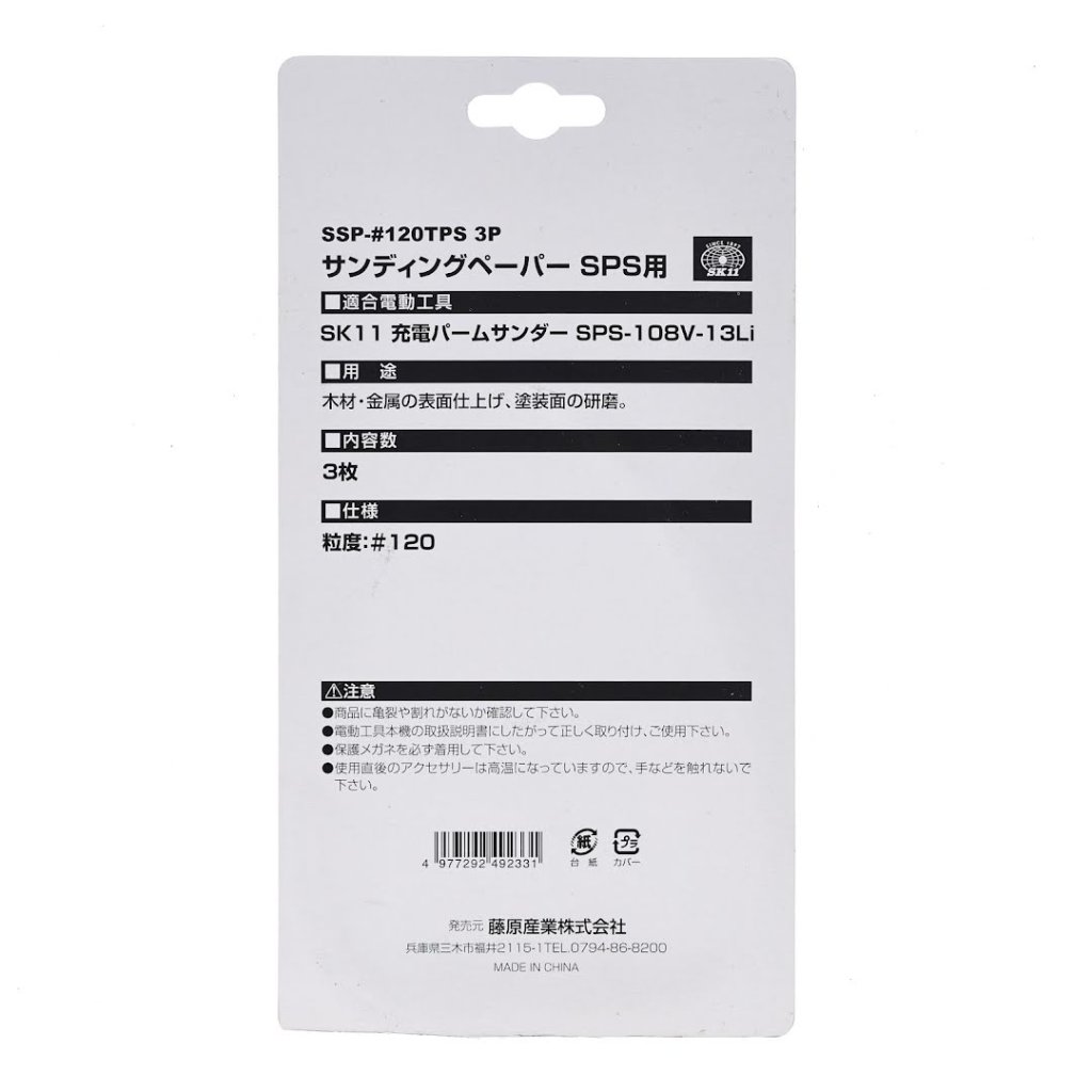 The SK11 Sanding Paper, model SSP-#120TPS 3P, is explicitly designed for the SK11 Cordless Palm Sander SPS-108V-13Li. It is ideal for medium sanding wood and metal surfaces, including corners and edges. Each pack contains three sandpaper sheets with a grit size of #120, ensuring a smooth and efficient sanding experience.
