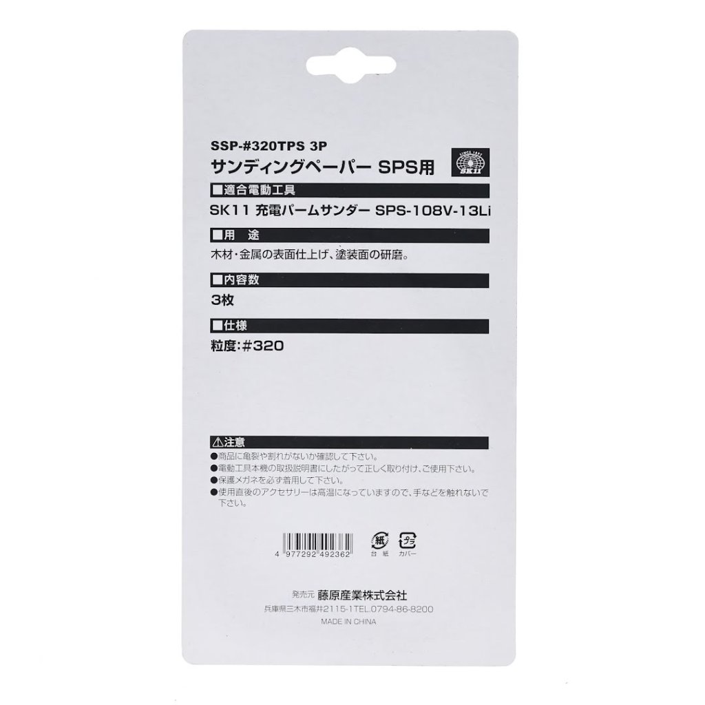The SK11 Sanding Paper, model SSP-#320TPS 3P, is explicitly designed for the SK11 Cordless Palm Sander SPS-108V-13Li. This sandpaper is ideal for finishing wood and metal surfaces, including corners. Each pack includes three sheets with a grit size of 320, perfect for achieving a smooth and polished finish in your woodworking and metalworking projects.