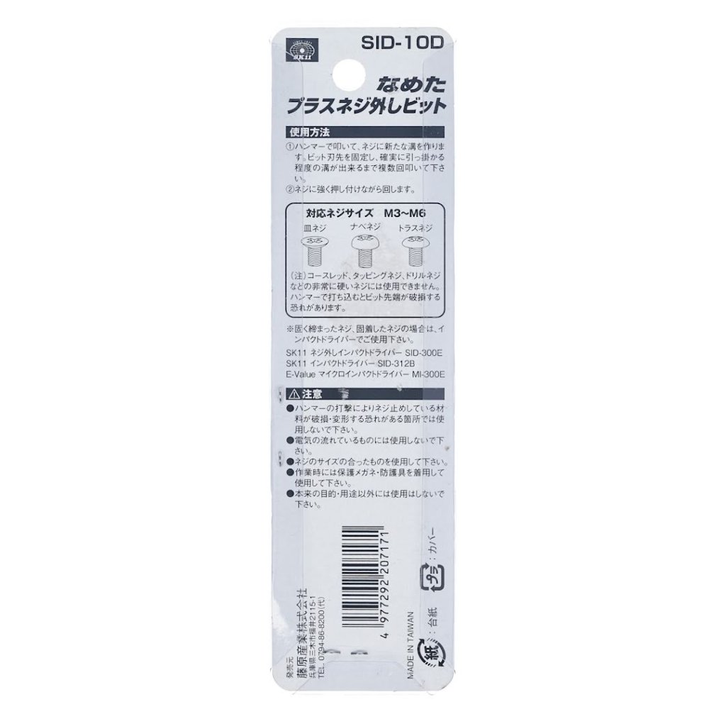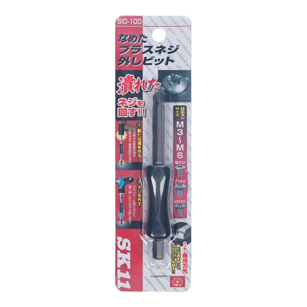 The SK11 Screw Extractor Bit, model SID-10D, is designed to remove stripped screws that a standard screwdriver cannot turn. The bit creates a new groove with its specialized cutting edge to effectively remove damaged screws. Suitable for M3 to M6 flat head, pan head, and truss head screws, it measures 16 mm in width, 100 mm in height, and 16 mm in depth and weighs 32 g. It is ideal for removing screws with damaged slots without causing additional damage.