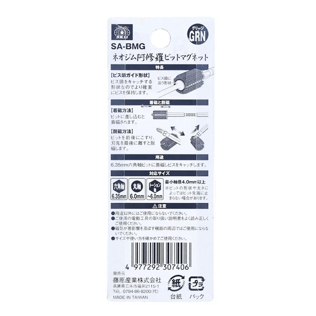 The SK11 Screwdriver Bit Magnetizer and Demagnetizer Ring, model SA-BMG, is a versatile tool for magnetizing and demagnetizing bits. It supports 6.35mm hex shank bits and is compatible with hex, round, and torsion shanks from 4mm to 6mm. The compact design (24 x 14 x 13 mm) ensures a precise fit, and the tool weighs only 7 g. The tool's unique shape helps secure screws more effectively, providing enhanced control and efficiency.