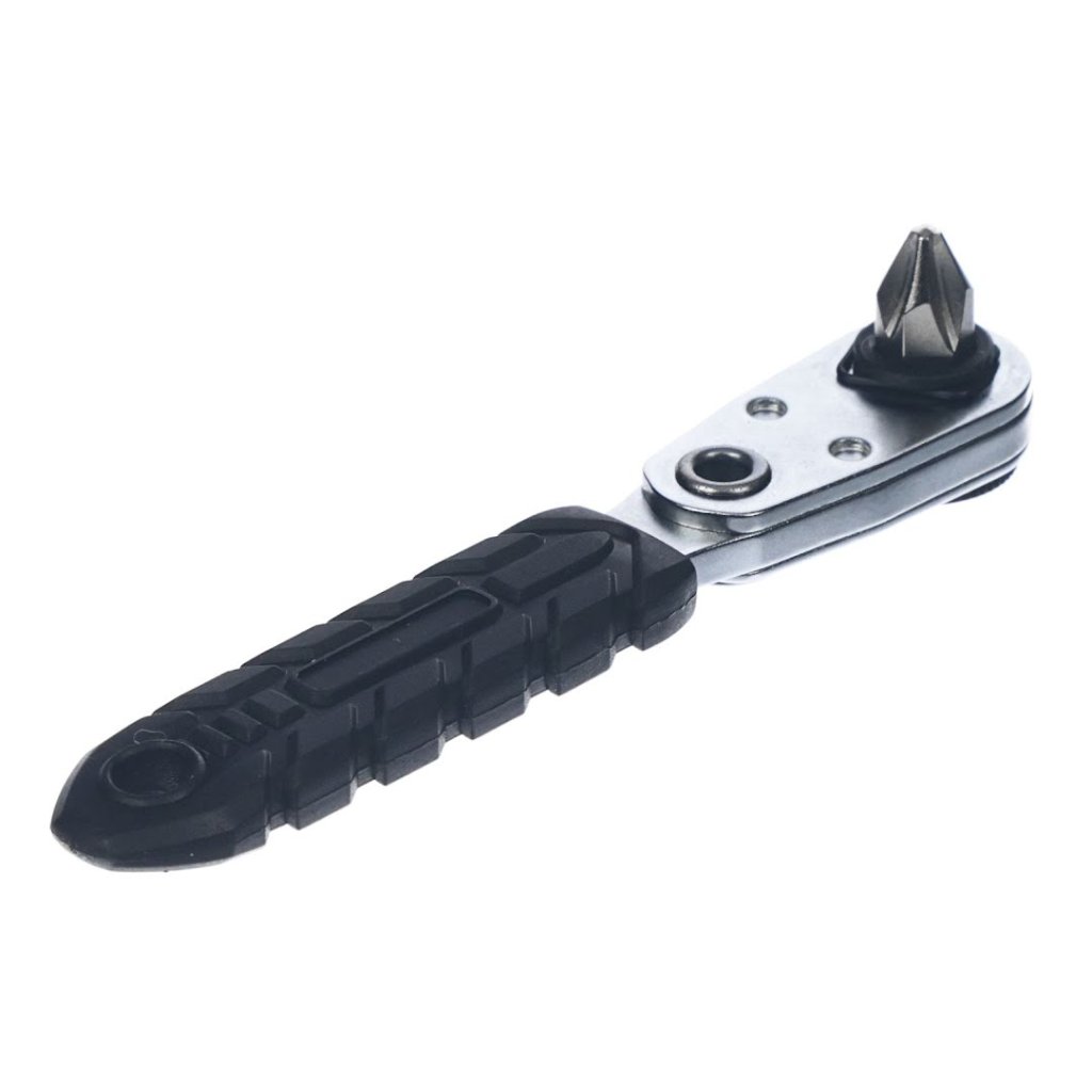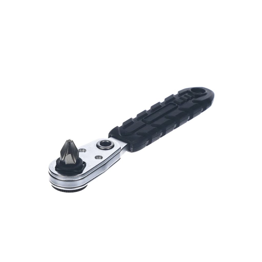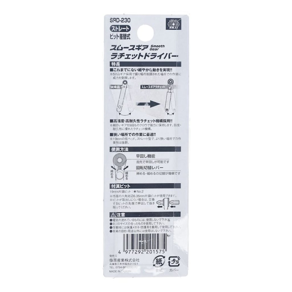 The SK11 Smooth Ratchet Screwdriver, model SRD-230, is designed for precision in tight spaces. It features a 52-tooth gear system, ensuring smooth operation with minimal swing arc. Its compact, straight design is perfect for areas with limited maneuverability. This tool is compatible with standard 6.35 mm hex bits, making it versatile for various applications. It has a No.2 Phillips and 19 mm flathead bit, enhancing its utility.