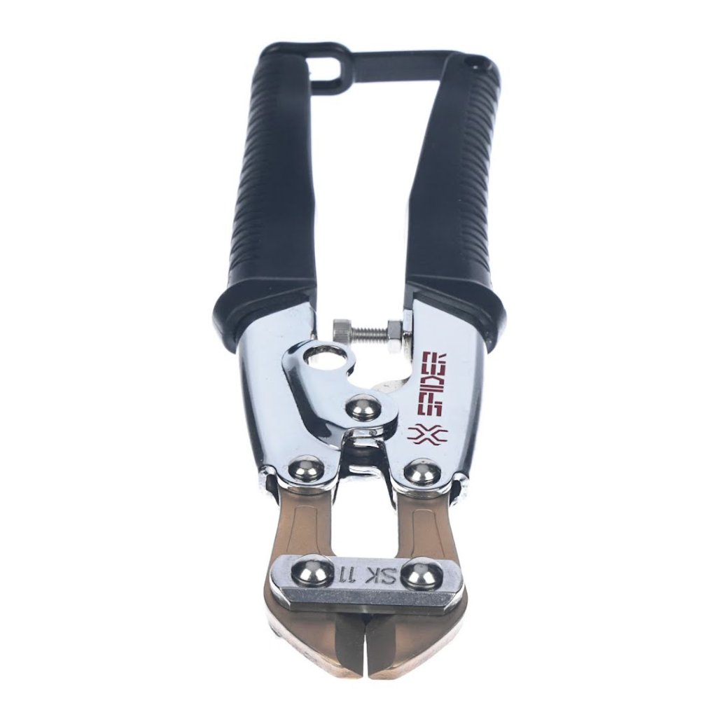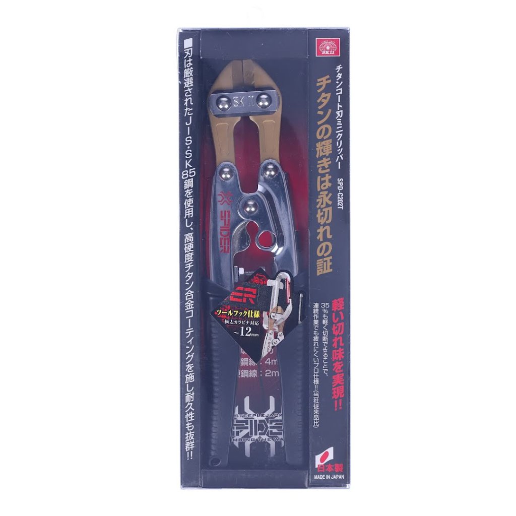 The SK11 SPIDER Titanium Coated Blade Mini Clipper, model SPD-C202T, is a premium tool designed for precision and durability. Its blades are coated with a high-hardness titanium alloy for enhanced durability and long-lasting sharpness, making it ideal for cutting soft steel wires and round bars. Thanks to the 2-mm-thick aluminum alloy handle, the pliers feature a lightweight yet robust structure designed to fit comfortably in the hand and reduce fatigue during continuous use. The cutting force is reduced by 35%, ensuring a light and easy cutting experience. For added safety, the tool includes holes for attaching a drop-prevention cord. With its cutting capacity of up to 4 mm for soft steel wire and 2 mm for hard steel wire, the SK11 SPIDER Mini Clipper is a professional-grade tool suitable for various cutting tasks.