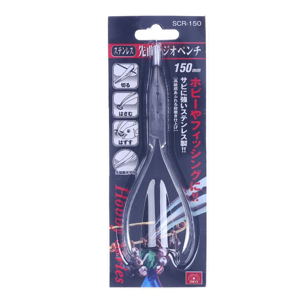 The SK11 Stainless Steel Long Bent Tip Pliers, model SCR-150, combine durability and precision for enthusiasts in hobbies and fishing. Its stainless steel construction resists rust, and the serrated tips ensure a firm grip on small parts. This tool is specifically designed for light-duty tasks, with a cutting capacity for copper wire up to 0.9 mm and a blade hardness of HRC 45-48. Measuring 53 mm in width, 152 mm in height, 12 mm in depth, and weighing 95 g, it's a compact yet effective tool for precise work.